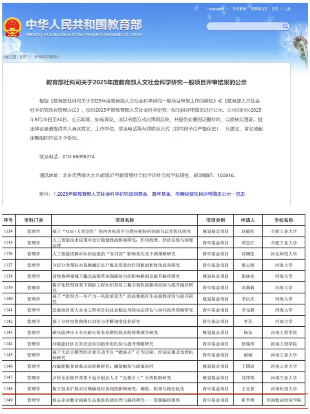 2025年9月25日,教育部社科司公布了2025年度教育部人文社会科学研究一般项目立项名单,365英国上市公司崔争艳博士主持的青年项目《核心企业数字创新生态系统构建机理与路径研究——资源编排视角》获得立项。该项目从资源编排的理论视角出发,深入探究核心企业如何构建与演化数字创新生态系统,具有重要的理论前沿性与实践指导意义。