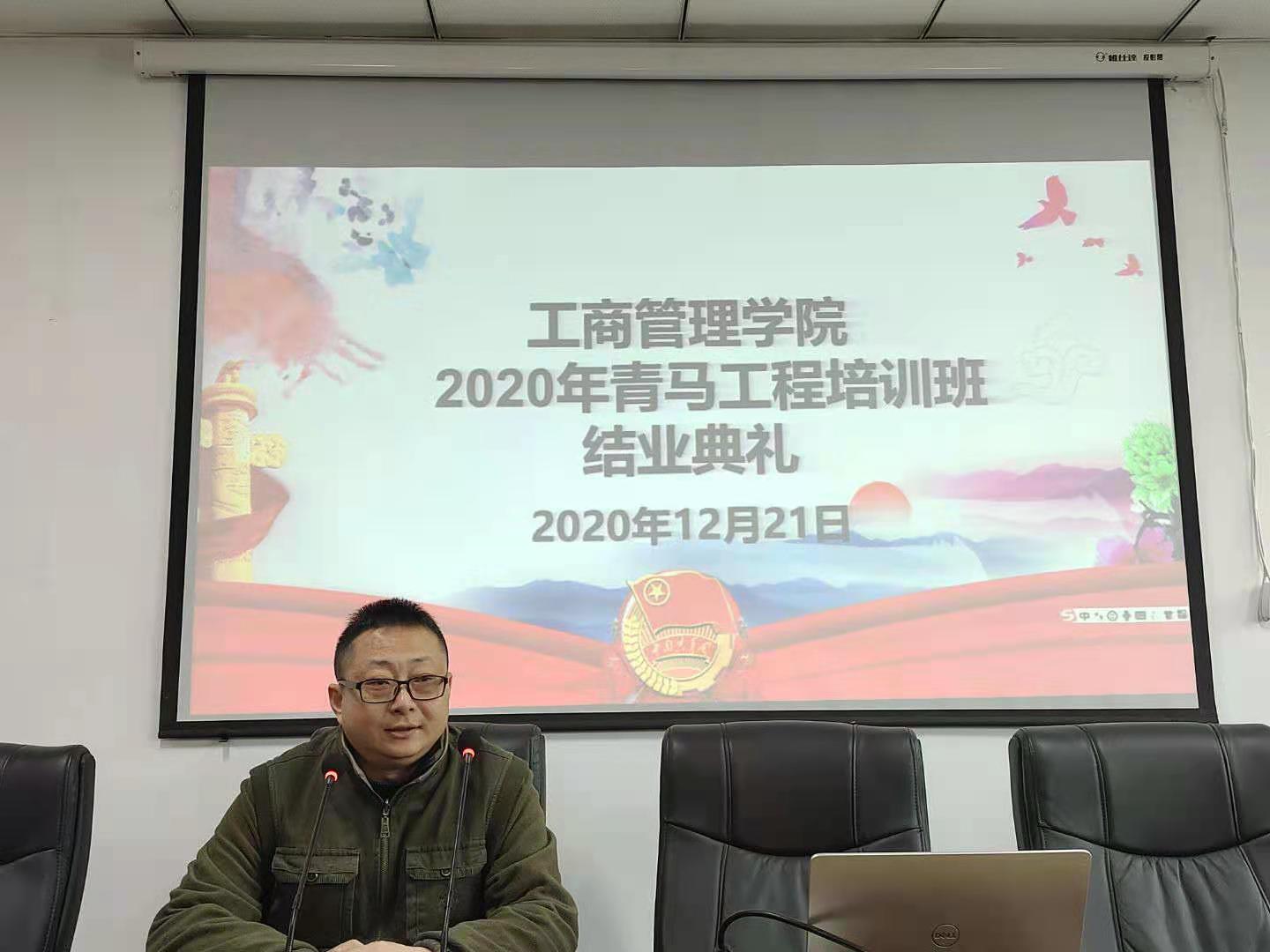 会议伊始,詹珅老师对本次结业的同学表示衷心地祝贺,并总结青马培训工程进行的一系列讲座内容,指出青马工程培训班是为了培养青年骨干力量,提高员工干部的综合素质,鼓励员工们在今后的学习与生活中,认真落实青马精神,发挥自身潜力,奋发向上,真正做到一个马克思主义思想的实践者。随后,詹珅老师为2020年“青马工程”老员工骨干培训班学员颁发结业证书并合影留念。最后,詹珅老师对本次结业典礼进行了总结讲话。詹珅老师真诚希望同学们能认识到马克思主义的真理性,努力成为一位真正的马克思主义者,积极参与社会实践,充分发挥员工代表的作用;希望同学们可以竭尽全力为同学们做真事、做实事;希望同学们在这大学四年里努力成长为一名政治坚定、德才兼备、模范表率、堪当重任的青年马克思主义者,为实现中华民族伟大复兴的中国梦贡献自己的青春、智慧和力量。