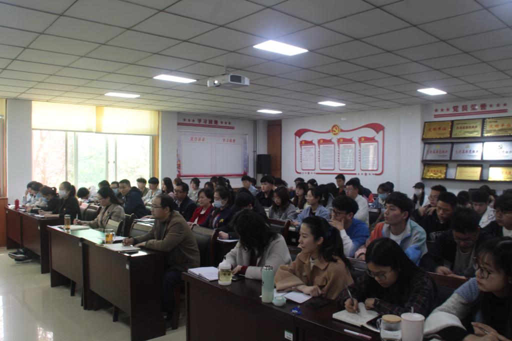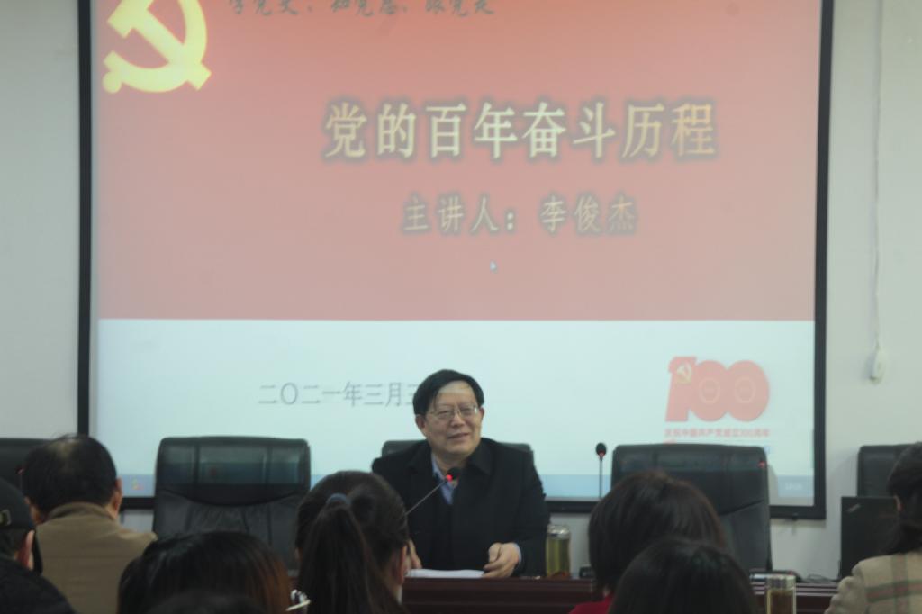 李俊杰书记首先将党的百年历史概括为“四个阶段”进行了详细的讲授,并对每个阶段的历史进程进行了详细梳理讲解,特别是对马克思主义中国化的过程进行了系统总结,带领师生们再次重温了党的峥嵘岁月和新中国的奋斗历程。第二部分,李书记以大别山精神、长征精神、抗美援朝精神等为切入点,与在座师生分享了个人在党史学习过程中的体会,特别是对新民主主义革命时期、抗日战争时期、社会主义革命和建设时期、改革开放时期和社会进入新时代阶段发生的重要战役、重大事件的理解和感悟。详实生动的历史案例讲解视野开阔、内涵深刻、精彩生动、层层递进,给在座的师生带来了一场丰富的思政盛宴,更加深了大家对树立正确的党史观、历史观、世界观的认识,让师生们明白了党的百年丰功伟业和人民幸福生活来之不易。最后他希望广大师生倍加珍惜现在的生活和学习环境,不忘初心、牢记使命,真正做到“学史明理、学史增信、学史崇德、学史力行”。