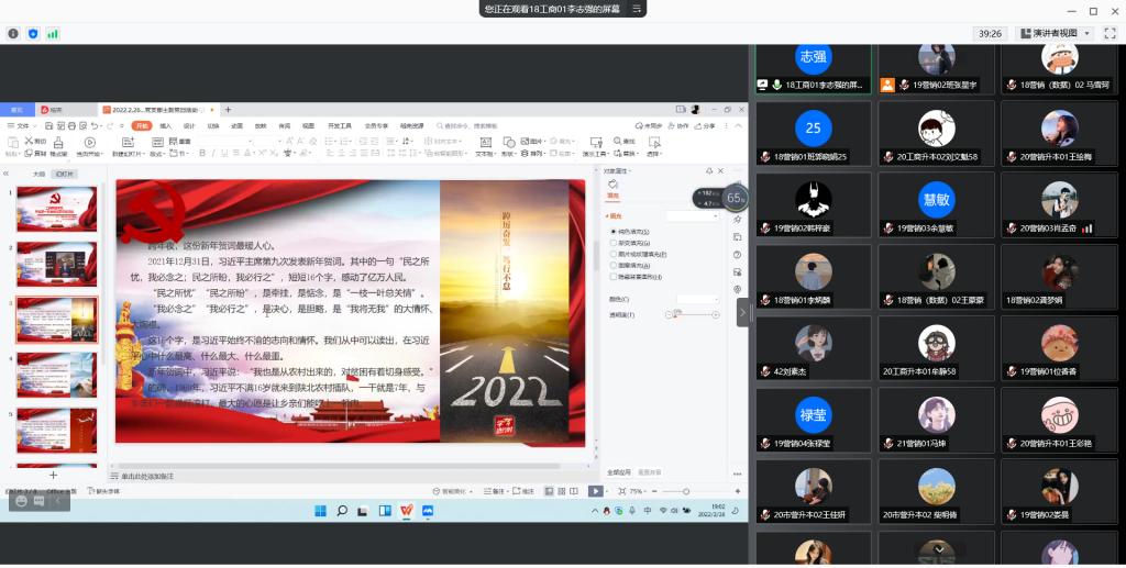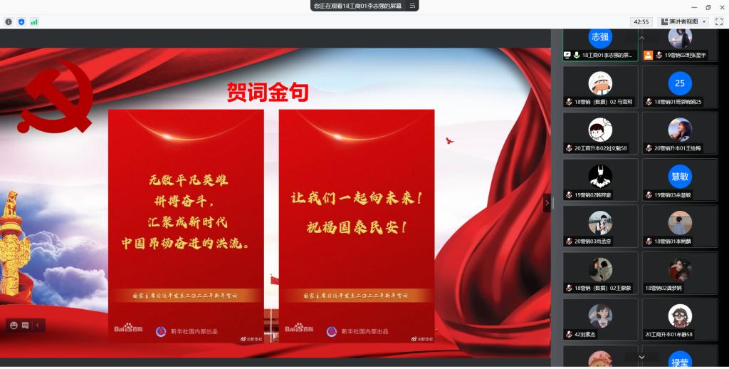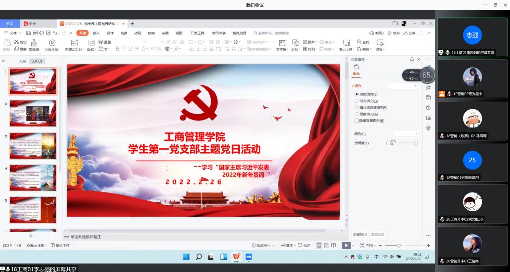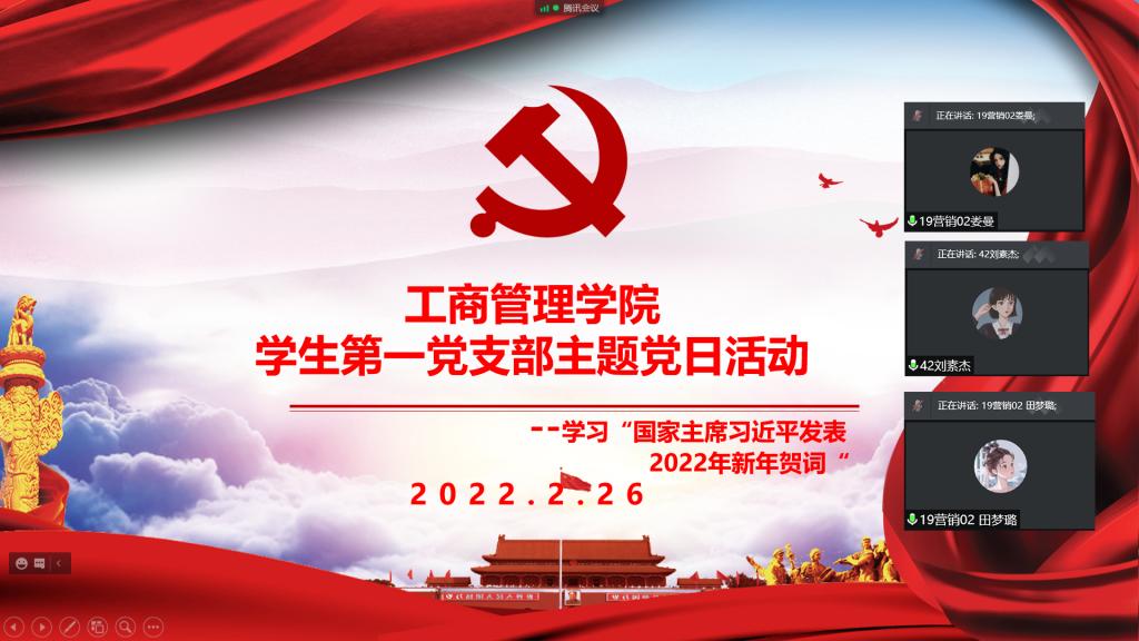 为切实提升员工党员政治素养和党性修养,提高员工党员的思想政治素质,增强员工党员的责任感与使命感,公司员工第一党支部于2月26日晚19:00通过线上会议的方式开展以“国家主席习近平发表2022年新年贺词”为学习内容的主题党日活动,员工第一党支部书记贾雪、组织委员孟琪、宣传委员古海云和支部全体在校生党员参加了此次会议。