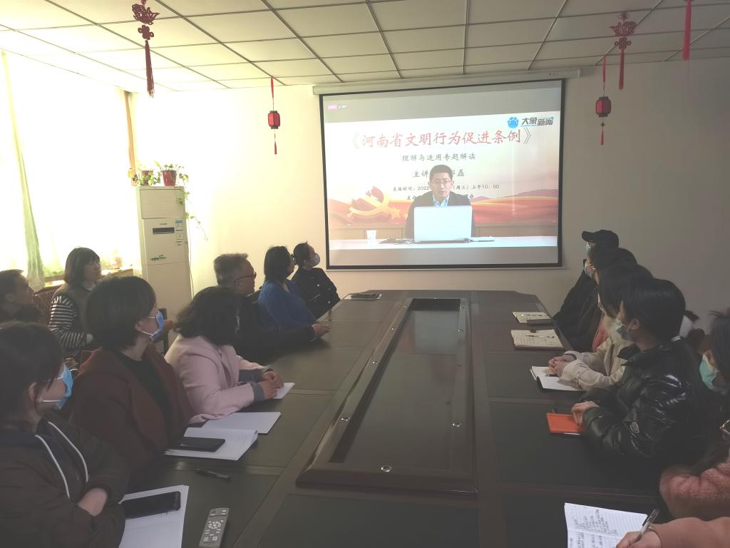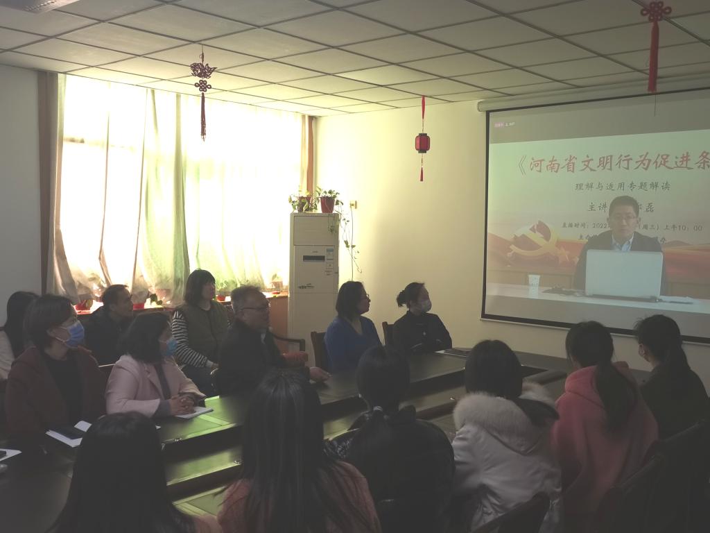 为进一步培育和践行社会主义核心价值观,弘扬中华民族传统美德,不断提高365英国上市公司全院师生文明素养,提升干部服务师生的能力作风建设,促进文明行为内化于心、外化于行,3月2日上午,公司组织老师认真学习了郑州大学法公司副教授郑磊专题解读《河南省文明行为促进条例》视频直播。