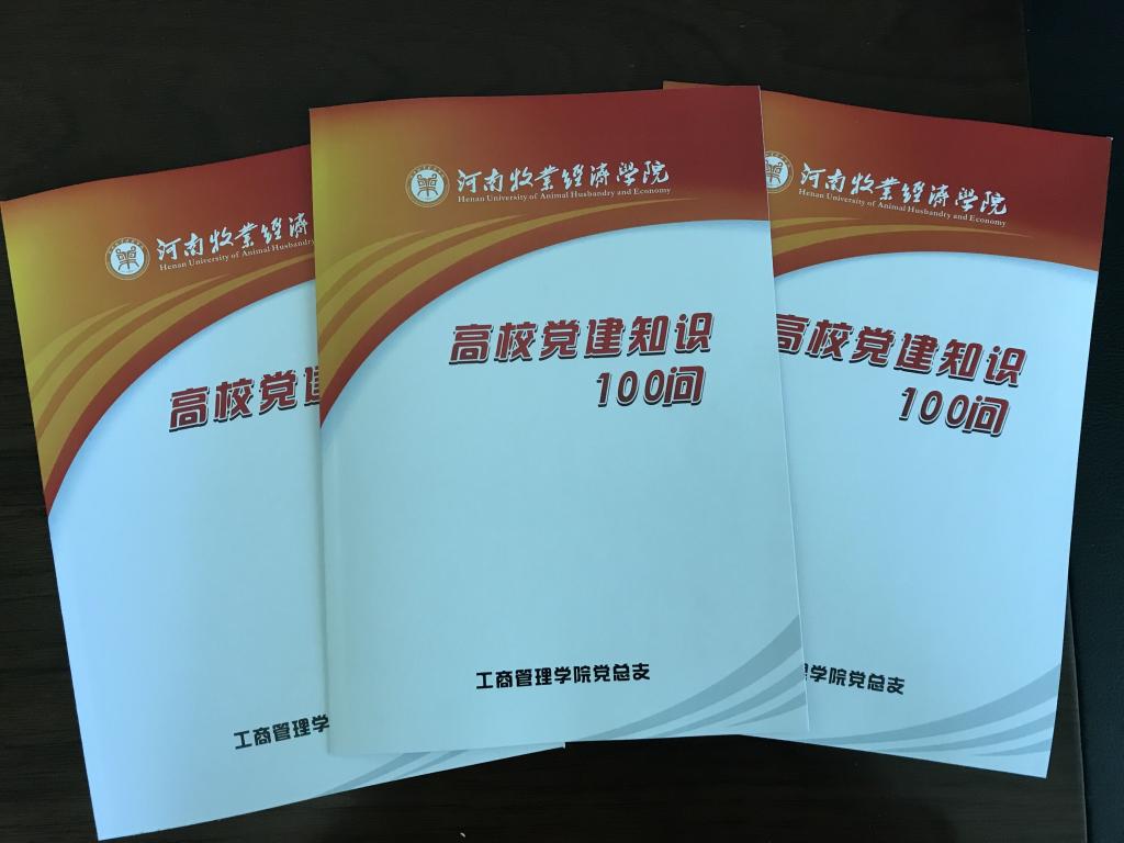 为了加强教师和员工党员对党建知识的学习,公司党总支结合高校实际,收集了高公司党建知识一百个问题编写了《高公司党建知识100问》发放给每一个党员,使党员可以随时随地对党建知识进行学习。争取通过学习,使全体党员更加牢固地树立“四种意识”,不断提高党性修养和规矩意识,争做“四讲四有”的合格党员,充分发挥出党支部的战斗堡垒和党员的先锋模范作用,来推动公司的各项工作不断发展。