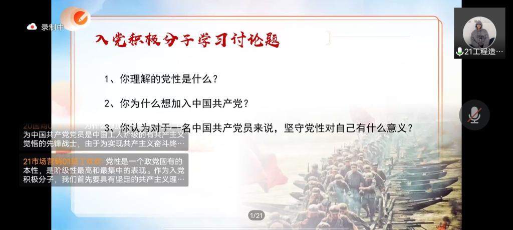 活动伊始,由主持人宣读本次培训安排。培训围绕“学党史,明党性”的主题展开,主持人以“加入中国共产党的原因?对党性的理解及坚守党性的意义”为题进行了提问,入党积极分子们在评论区踊跃参与回答,发表自己的理解与感悟。随后,主持人组织大家观看了有关“党史发展”、“党的发展历程”和“疫情之下,党员先上”的视频资料,视频中展现出革命先辈的奋斗精神和爱国主义精神,使各位入党积极分子深有感触。入党积极分子们连麦分享了对自己产生深刻影响的优秀党员事迹,还向大家推荐了《我和我的祖国》、《长津湖》等优秀红色影视作品,并表达出自己要在后疫情时代中挺身而出的决心。最后,主持人对学员们的发言进行了总结,并呼吁各位入党积极分子珍惜现在的生活,努力做一个有思想、有作为的进步青年。