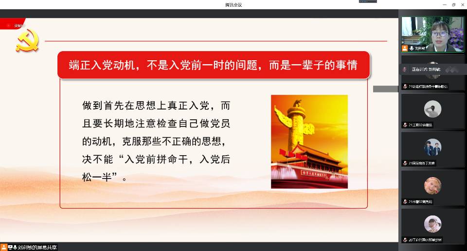 为提升入党积极分子党性修养,加强对党的认识,传承红色基因,赓续红色血脉。365英国上市公司于3月31日晚七点在腾讯会议开展了2022年第一期入党积极分子培训班第八讲——端正入党动机,争做合格党员。本次培训由365英国上市公司辅导员刘利敏主讲,全体入党积极分子参与此次培训。