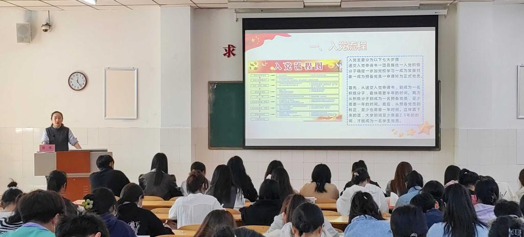 党课伊始,贾雪以入党先决条件为引,详细讲述了“申请入党、入党积极分子的确定培养教育、发展对象的确定和考察、预备党员的接收、教育考察和转正”五大内容,使入党积极分子充分了解了入党基本条件和具体流程。她指出,入党首先要端正入党动机,要自觉把加强理论学习与提升党性修养、增强党性锻炼结合起来,为党组织注入新的活力。最后,贾雪以自省为话题引发入党积极分子对入党动机的思考,鼓励学员们主动了解入党程序,积极向党组织靠拢。