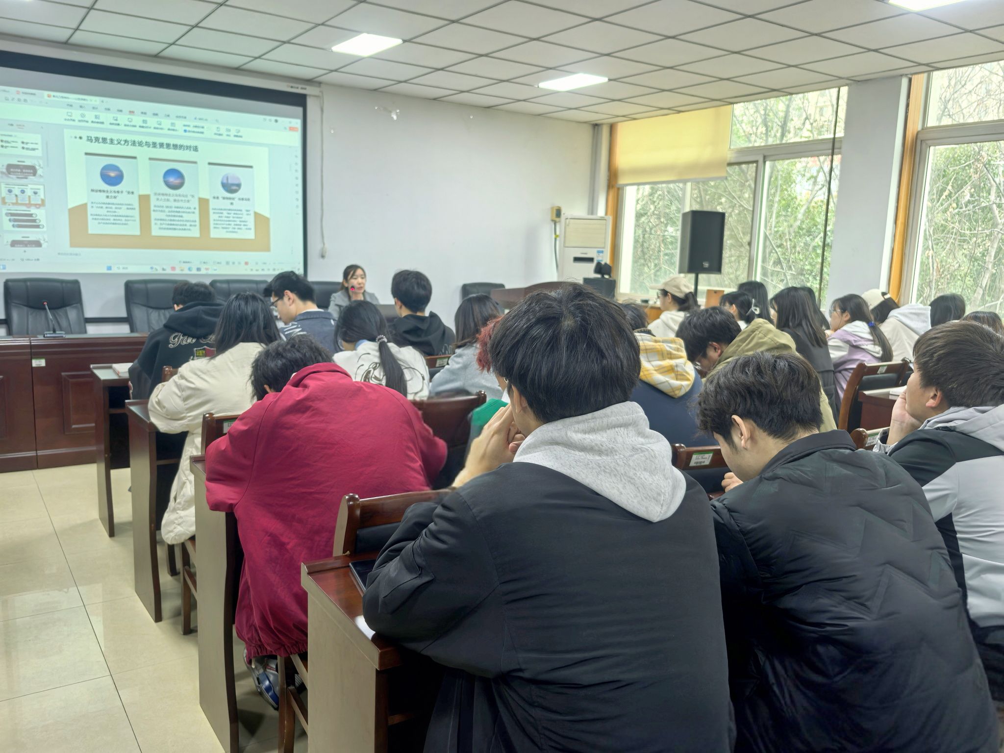 培训开篇,席亚芳副书记以“正心正念,守正创新、引领成长”为切入点,深入剖析班级骨干于日常学习生活中应当具备的素养与担当。着重强调,班级骨干务必时刻秉持正心正念,以身作则,切实发挥模范带头作用,成为同学们学习的表率。接着,在经典积累方面,席亚芳老师鼓励同学们日常除了学习党的基本理论外,还可以多读经典著作,如《大学》《中庸》《论语》《道德经》《传习录》等,通过引经据典提升自身文化层次与综合素质。她指出,经典著作蕴含着丰富的智慧与哲理,能够为同学们提供更广阔的思维视野和更深厚的文化底蕴。最后,谈及自我认知与心态调整,席亚芳老师激励同学们切勿自我设限,坚信通过持续学习能够有效提升个人能力。悉心教导大家积极调适心态,多聚焦积极层面,合理运用吸引力法则,以更加乐观向上的态度直面学习和生活中的各类挑战。