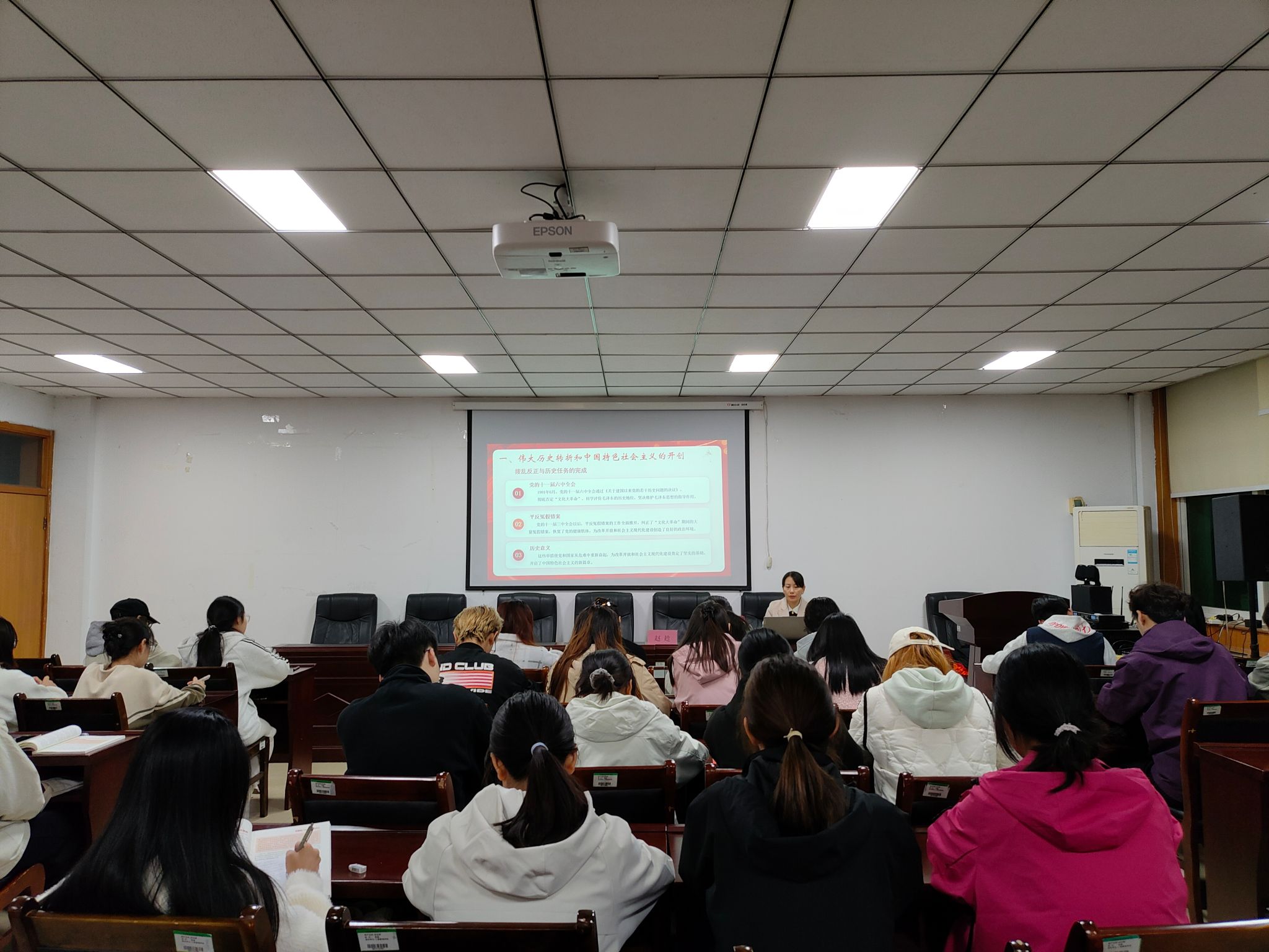 党课伊始,赵趁带领入党积极分子们回顾中国共产党的光辉历程。随后,赵趁从“夺取新民主主义革命伟大胜利”、“完成社会主义革命和推进社会主义建设”、“进行改革开放和社会主义现代化建设”、“开创中国特色社会主义新时代”四个方面开始讲解本次主题。她指出中国共产党是中国革命取得胜利的根本保障。最后,赵趁指出作为新时代青年应当坚定不移跟中国共产党走,坚决维护中国共产党的领导地位。