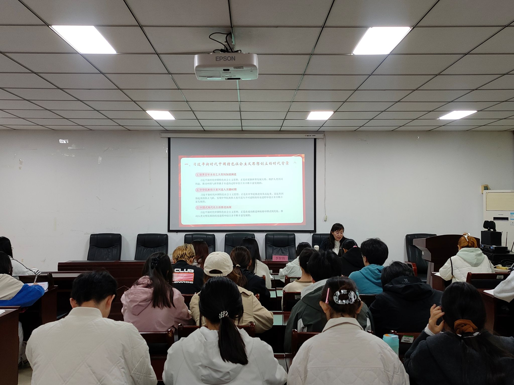党课伊始,李智伟带领入党积极分子们学习习近平新时代中国特色社会主义思想。随后,李智伟从“习近平新时代中国特色社会主义思想创立的时代背景和历史地位”、“理解和把握习近平新时代中国特色社会主义思想”、“以习近平新时代中国特色社会主义思想武装头脑、指导实践”三个方面开始讲解本次主题。她指出习近平新时代中国特色社会主义思想是新时代中国共产党和国家事业发展的根本遵循,我们要不断地深入学习。最后,李智伟指出作为新时代的青年,要围绕习近平新时代中国特色社会主义思想努力学习科学文化知识,实事求是,不怕困难,为实现中华民族伟大复兴贡献自己的一份力量。