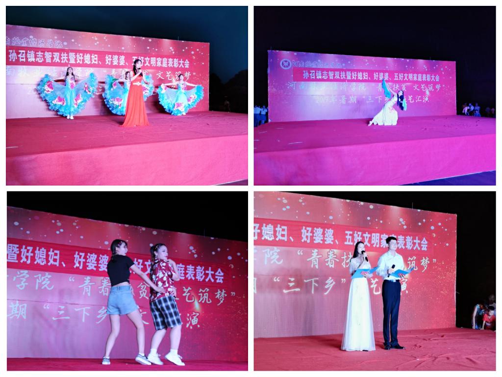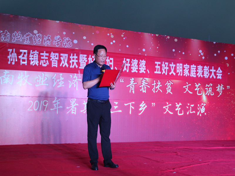 为深入学习贯彻习近平新时代中国特色社会主义思想,充分发挥高校在脱贫攻坚中的重要作用,使公司暑期“三下乡”社会实践活动,青年志愿者服务更贴近百姓的精神文化生活,助力校地帮扶,文化惠民。在校团委的精心安排和部署下,由公司组织承办的赴驻马店新蔡县大马庄村“青春扶贫文艺筑梦”2019年暑期“三下乡”文艺汇演社会实践活动于7月8日在新蔡县孙召镇群众文化广场成功举办。