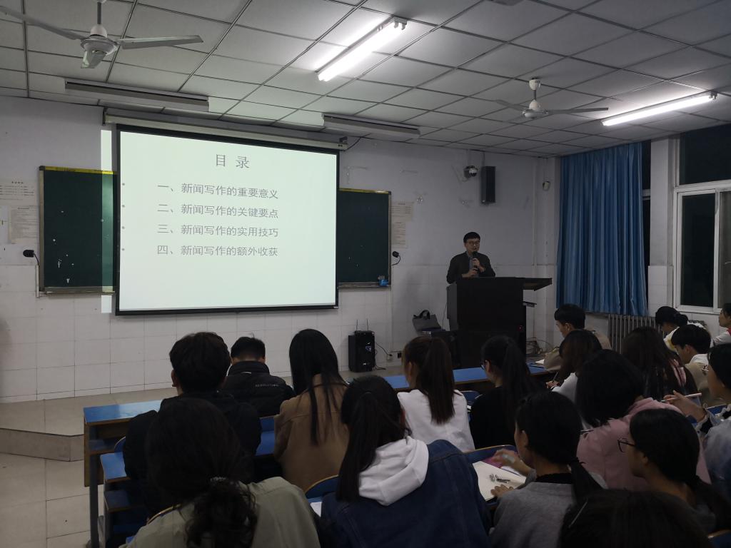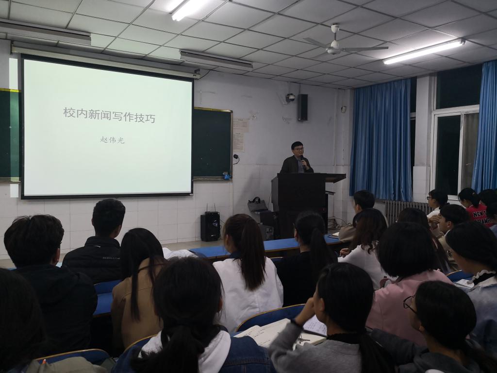 10月31日晚,英才校区教学楼E205教室内座无虚席,气氛活跃。为提高员工干部的新闻写作水平,365英国上市公司在此举办员工团干部专题培训,特邀员工处赵伟光老师讲授校内新闻写作技巧。200余名员工干部聆听讲座,讲座由公司团总支书记周倩主持。