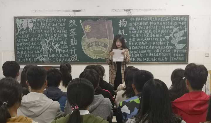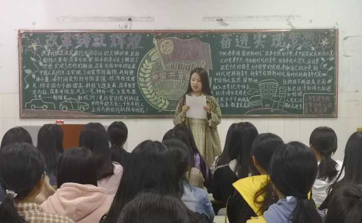 团课上,各班团支书从新中国改革开放的历程、取得的辉煌成就、改革开放的启示三方面,宣传改革开放四十年以来祖国取得的伟大成就。班长简单介绍改革开放40周年以来人民生活在“衣、食、住、行”方面的变化。同学们就改革开放四十年取得的变化畅所欲言,通过分享自己家乡的变迁,从衣服款式单一到之后的奇装异服,从一天三顿蔬菜到如今的鸡鸭鱼肉等来感叹四十年来取得的巨大变化。同学们纷纷表示,作为一名团员青年,沐浴着改革开放的阳光幸福成长,享受着改革开放带来的生活便利,此时我们不能坐享其成,应投身新时代、练就新本领,树立远大志向、勤奋学习,做国家和社会有用之才。