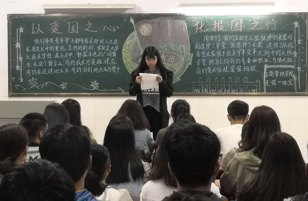 为响应国家号召,帮助公司员工深入了解参军入伍的最新政策与流程,正确认识参军入伍的重要意义,激发同学们的参军热情,推动征兵宣传工作的顺利开展。公司于4月12日在教学楼A楼举办了“参军报国,准备出发”主题团课,共有17级国际商务一班、17级国际商务二班、17级连锁经营管理一班、17级连锁经营管理二班、17级工商管理一班、17级人力资源管理一班六个班级三百余人参加此次团课。