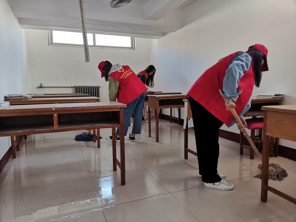 活动开展前,志愿者们分工合作制作了宣传条幅、标语以及手抄报,并以小组为单位分为两组,一组在红色花蕊进行横幅签字、宣传活动主题等工作,另一组到所分配的自习室清理卫生。