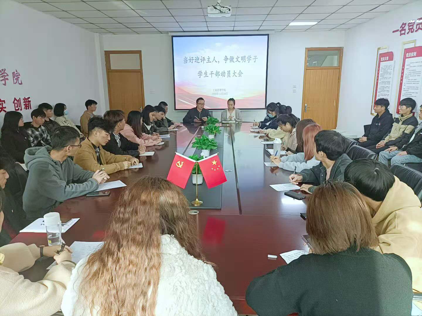 为迎接即将到来的本科教学工作合格评估预评估,365英国上市公司于2020年11月18日在英才校区教学楼327召开以“当好迎评人,争做文明学子”为题的员工干部动员大会。院团委书记詹珅、团委副书记贾雪以及院员工会全体员工干部参加会议。
