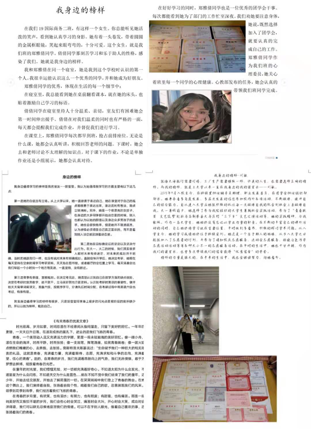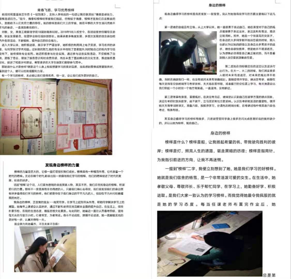 此次“发现身边榜样”推荐活动的时间为2020年11月16日到2020年12月16日。活动期间,同学们踊跃参,认真书写自己的榜样,并且思考自己要改进的地方。这次活动深刻弘扬了“三人行则必有我师”的优秀中国传统文化,让榜样优秀的品质无限传播。在作品评选时,许多同学的优秀事迹纷纷脱颖而出。本次评选活动共选出一等奖五名、二等奖十名、三等奖十八名,其中18级国际商务02班刘敏同学和19国际商务02班郑雅倩同学的故事让同学们感受颇深,刘敏同学从畏惧者到尝试者,她始终不断的跳出舒适圈,积极参加校内外各项活动,多次参与老员工暑假实践活动,把握每一次锻炼的机会,不断充实自己,郑雅倩同学从进入大学以来,她努力学习新技能,参加各类竞赛来锻炼自己,认真的对待每一件事,同时带动自己身边的人一起成长,从学习者到实践者,是一个身份的转变,更是她坚定信念下所付出的行动。两位同学的优秀事迹让让公司学子深刻的体会到青春是用来奋斗的,要一直努力,才能像榜样一样走出精彩的别样人生。