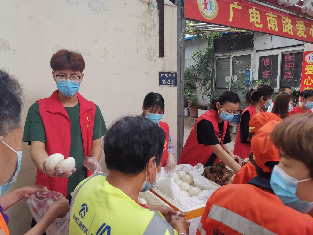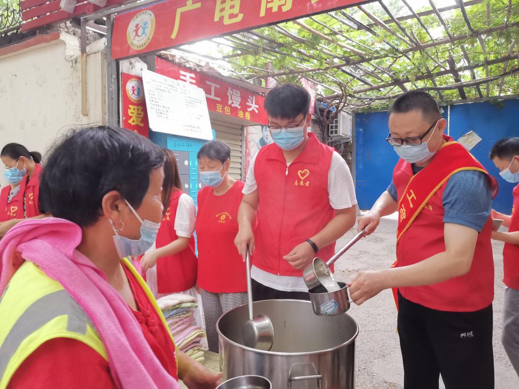为了让环卫工人们早点吃上早餐,早上4点30分,党员志愿者们就起床在公司门口集合,5点整就到了广电南路的爱心粥屋。詹珅老师对这次活动做了细致的分工,大家团结协作,有条不紊的忙碌着,解冻粽子、上锅蒸馍,熬煮红枣粥,党员志愿者们爱心满满,把粽子、馒头、热粥送到6点整集合完毕的环卫工人的手中。活动现场,詹珅老师代表公司党委将党团志愿者利用课余时间义卖报纸筹得的善款2406.5元,捐赠给爱心粥屋店长魏爱荣老师。据不完全统计,共为230多名环卫工提供了爱心早餐,满目的橘红好像晨曦中最灿烂的一缕阳光,现场洋溢着快乐、温馨的气氛。