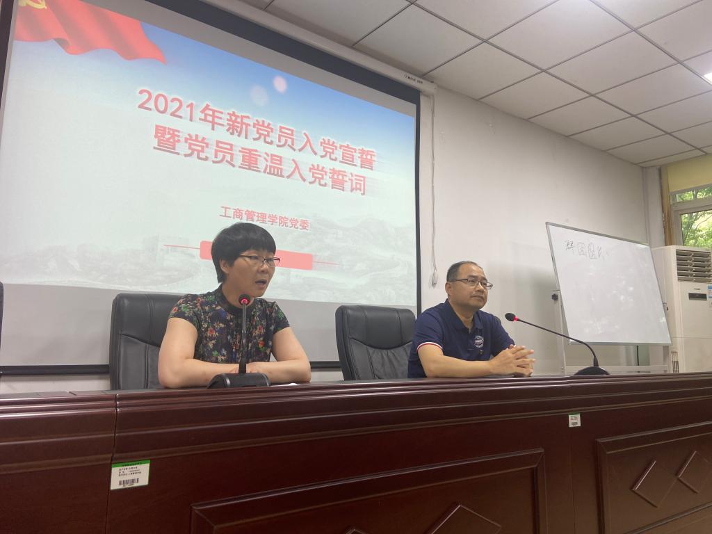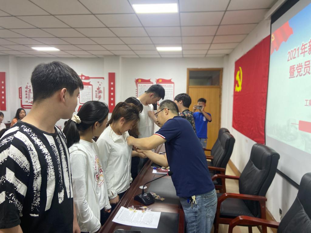 下午5:30,仪式在雄壮的《国际歌》声中拉开序幕,员工第一党支部书记贾雪同志宣读了新入党宣誓名单,全体新老党员精神抖擞、整齐列队,在员工第三党支部书记詹珅同志的领誓下,新老党员代表面向党旗庄严宣誓。老党员代表员工第二党支部书记杜换霞同志和新党员代表20市场营销升本班余颖同志分别作了发言,表达了对党的无限崇敬和热爱以及为党的事业奋斗终身的坚定决心。会上,王桂朵书记、王国辉副书记分别为新入党党员代表佩戴党员党徽。