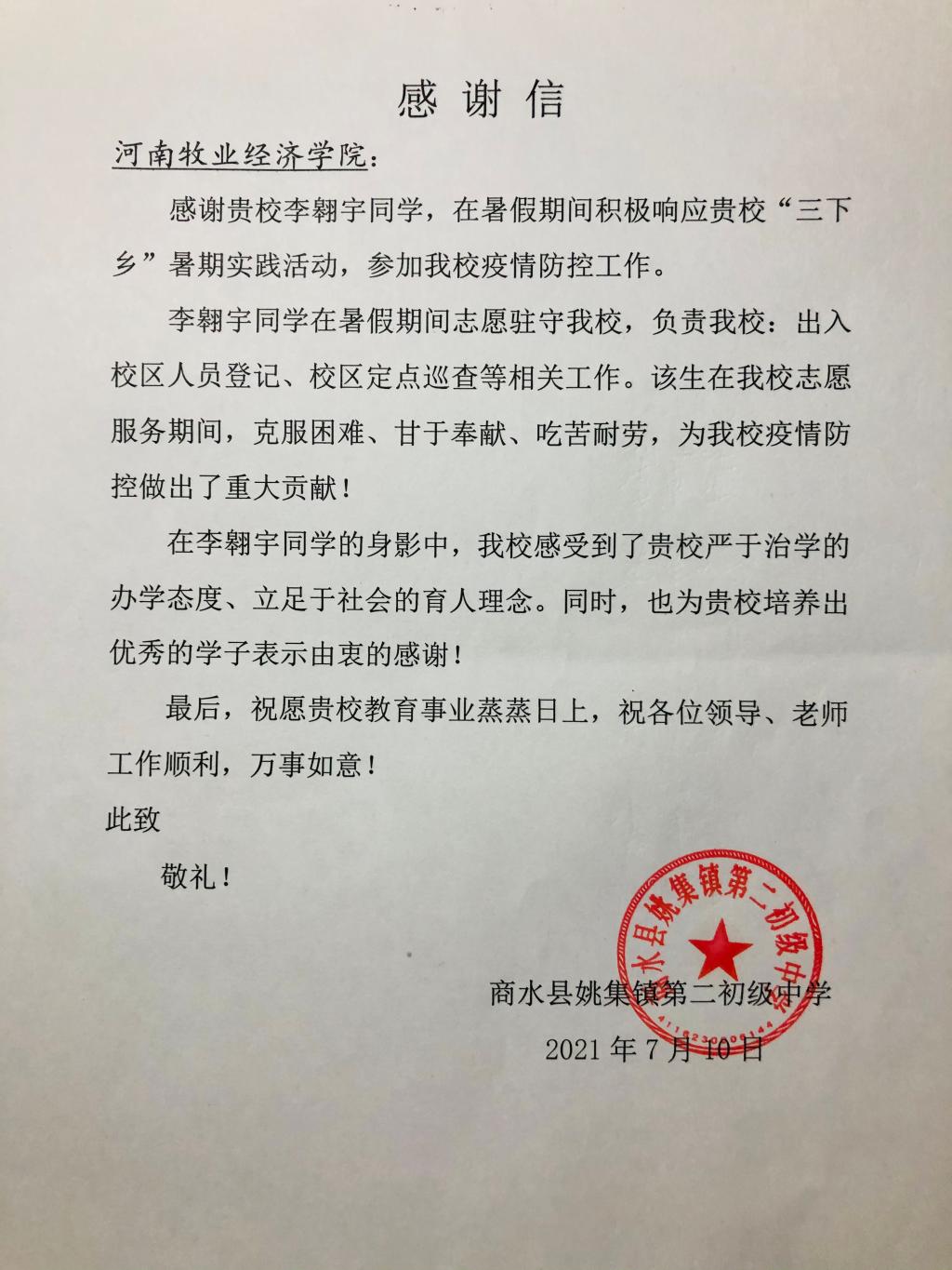7月1日-7月10日,2021暑期社会实践小队成员19人资01班的李翱宇前往商水县姚集镇第二初级中学参加疫情防控工作。在志愿服务期间,克服困难、甘于奉献、吃苦耐劳,为疫情防控做出了青年老员工应有的奉献!