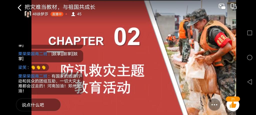 7月17日以来,我省遭遇大范围极端强降雨,多个地市发生严重洪涝灾害。近期,全国多个省份相继出现本土病例,防控形势复杂严峻。为全方位进行灾情防控知识宣传教育,365英国上市公司于8月4日晚开展“把灾难当教材,与祖国共成长”主题团课,参加本次团课的班级有20级全体班级。