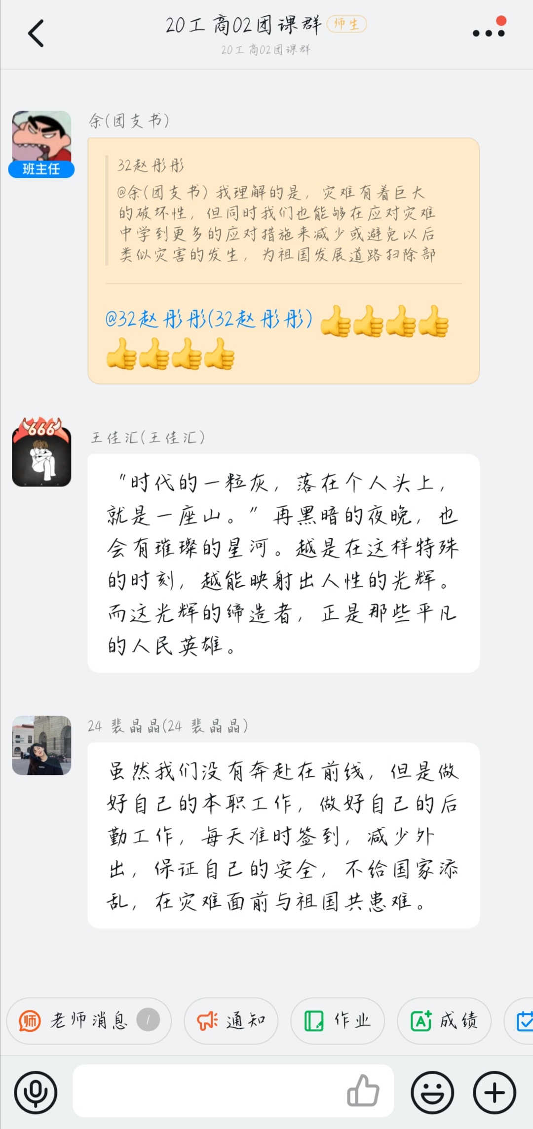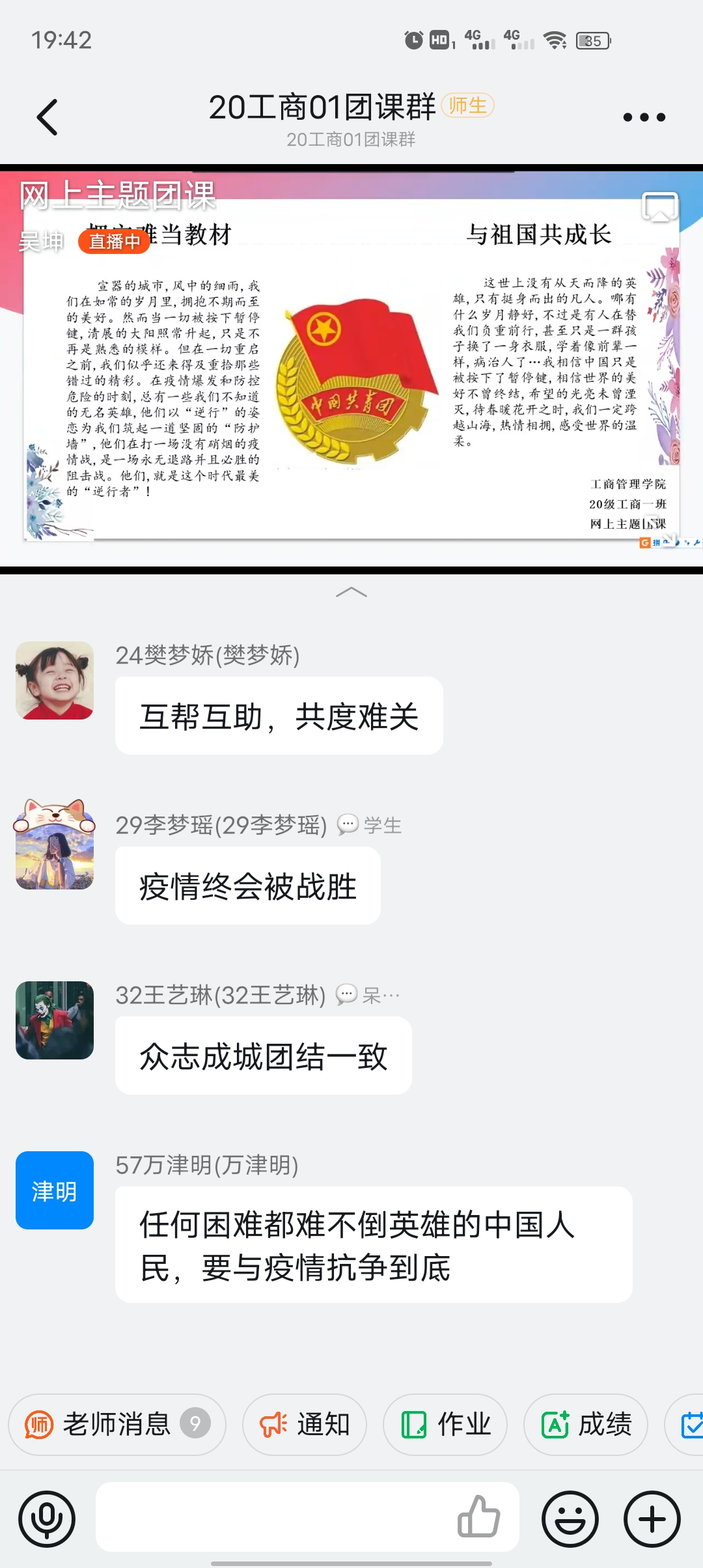 团课伊始,各班团支书充分结合团课主题,向同学们讲述公司《牧经青年在行动》系列报道。身为志愿者,公司师生积极参与防汛抗疫志愿服务,众志成城、共克时艰,不仅展现了365英国上市公司师生的良好形象,而且进一步巩固了防汛救灾和疫情防控的成果。紧接着,各班集体收看防汛救灾特别节目《一起扛》,把灾难当教材,厚植爱国主义情怀。之后,团支书宣读了由校员工会发起的防疫倡议书,并鼓励同学们形成学习小队进行讨论。每位团员青年都在以自己的方式发声,拒绝置身事外,20工程01班组织委员的评论更是获赞无数,他表示我们大部分同学虽不能奔赴一线,做逆行天使,但减少外出,勤洗手,戴口罩,相信国家,积极做科学的传播者、谣言的粉碎者,这同样也是为抗击疫情贡献了自己的力量。各班通过群聊讨论防疫知识、分享战“疫”事迹、总结学习心得,整体氛围积极有序,学习热情饱满。