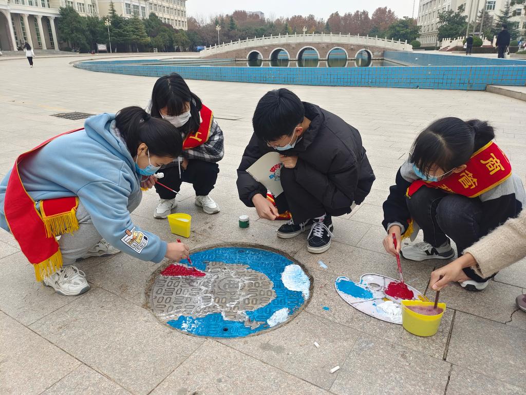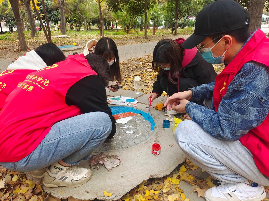 活动前期,志愿者们确定活动场地,准备材料物资,规划人员分组,同时对活动进行宣传。活动进行时,志愿者们领取各组需要的物资。根据活动前确定好的绘画图搞,在画图前对井盖进行清理。志愿者们用粉笔描绘图案后使用颜料进行涂色,各组分工协作,活动有序进行。活动结束后,志愿者对现场进行了清扫,确保活动环境的干净整洁,同时树立警示牌预防同学对未干的图案进行破坏。此次活动对共建一个安全、美丽、多彩的校园有很好的促进作用,也让冬日校园多了一份善意与温暖。