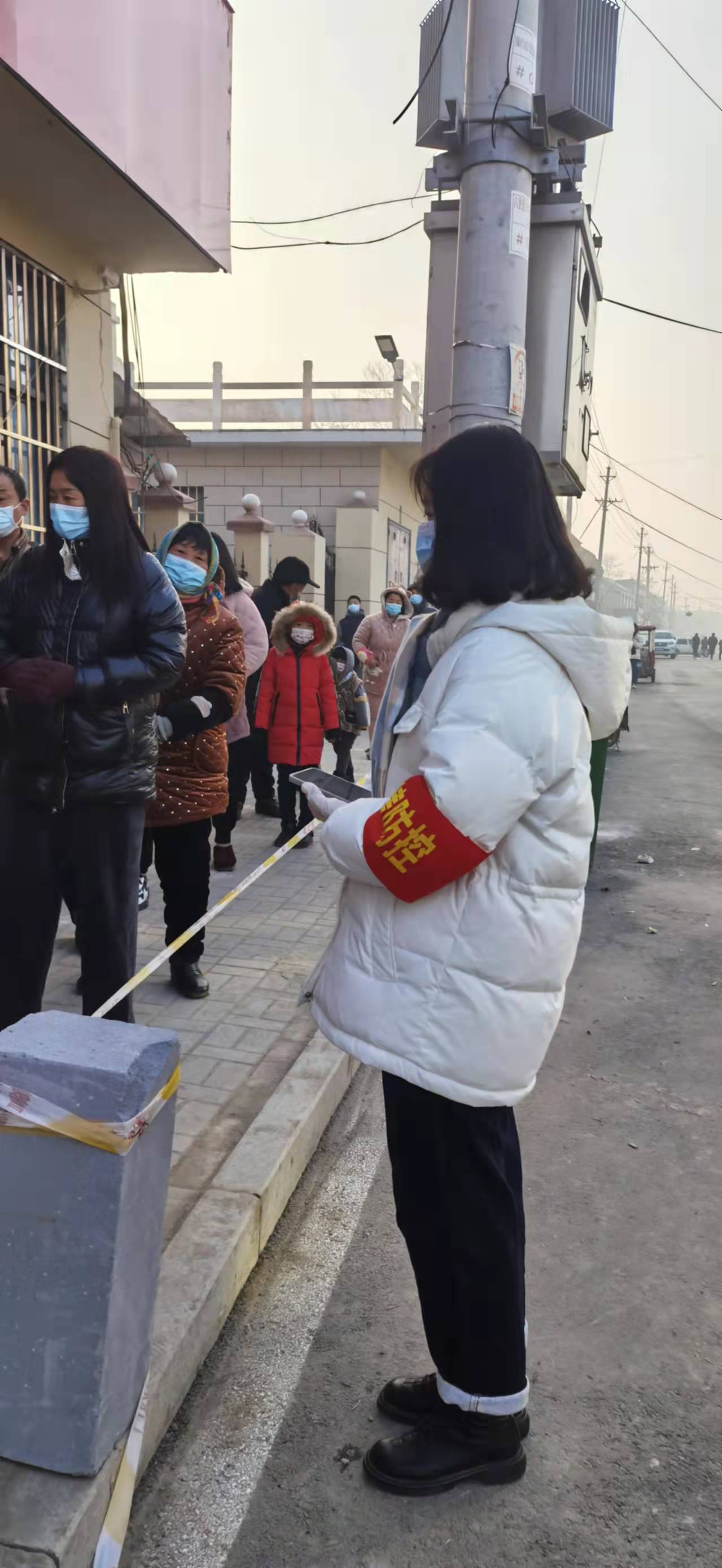 在2022年1月,21国商01刘瑜琦的家乡面临着疫情的威胁。她看着凌晨忙于核酸检测的医护人员、维持秩序的党员以及紧张担忧的乡亲,便萌发了为抗击疫情奉献自己力量的想法,于是第一时间响应公司的号召,报名加入了志愿者队。