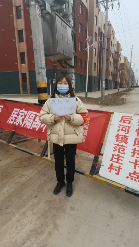 集团寒假放假后,郑州突发疫情,周边县市也都有隐患。疫情就是命令,防控就是责任。家住长葛市后河镇范庄的21国商01田佳琳同学积极主动响应号召,主动投身打赢抗击新型冠状病毒感染肺炎疫情防控的硬仗中去,到疫情防控工作一线中去,争做“防疫”战士。