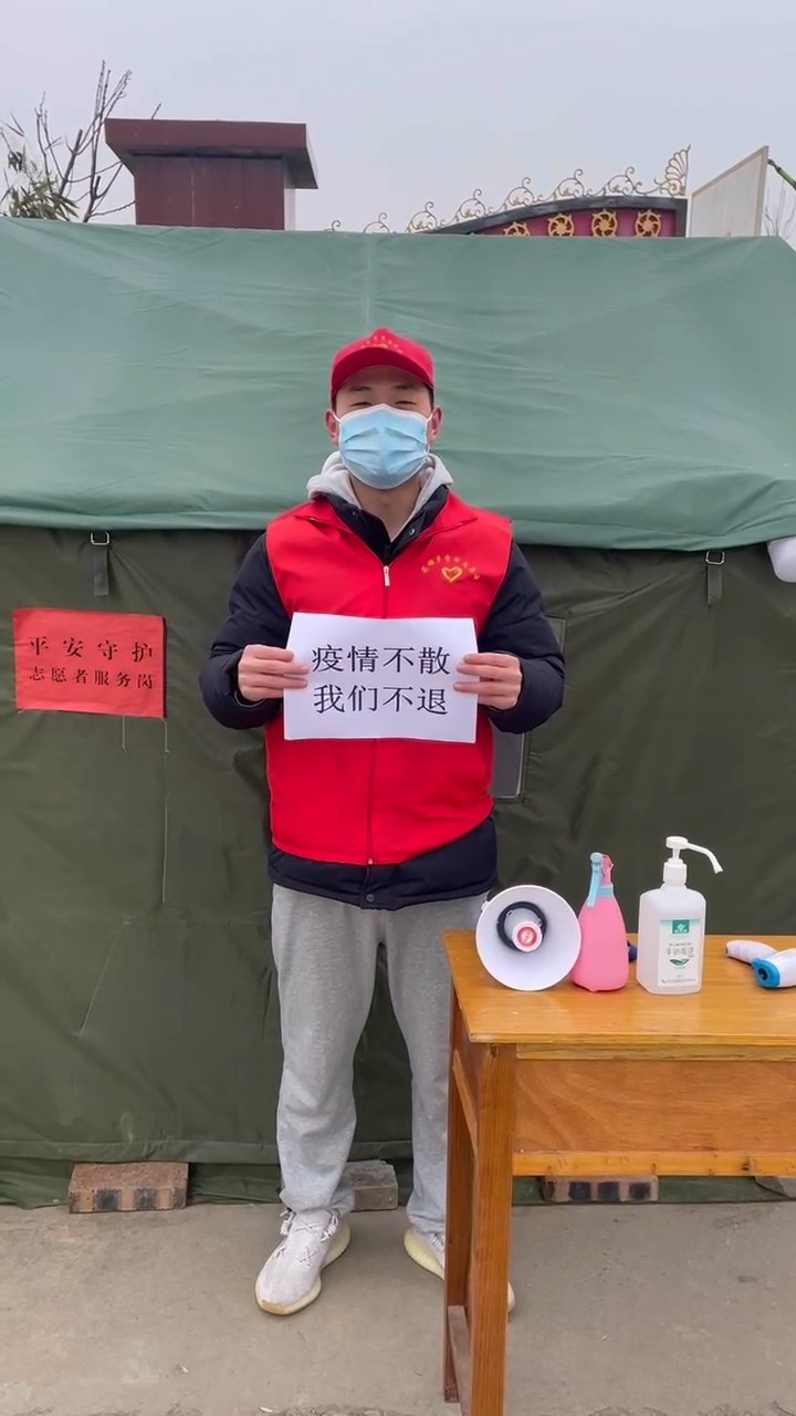 1月5日,河南省驻马店市驿城区胡庙乡王庄村村大队开始招收疫情防控值班志愿者时,作为21工商02的一名学子,21工商02梁峰斌同学怀着激动的心情加入了这个队伍。在值班期间,他平均每天10个小时以上站在岗位上,让来往的人员出示健康码,为来往人员测量体温,喷洒酒精进行消毒,再登记他们的基本信息,又用微笑迎送每一名积极配合防疫工作的同胞。无论风是否强烈,还是雨特别寒冷,一想到他自己做的事情,一想到村民们的安全,就让梁峰斌同学充分感受到了作为一名疫情防控值班志愿者的荣誉感,为村里的乡里乡亲们筑起一道自己力所能及的防线,为祖国的防疫大业做出自己的一份贡献。在他心中牢记祖国号召:疫情不散,我们不退。