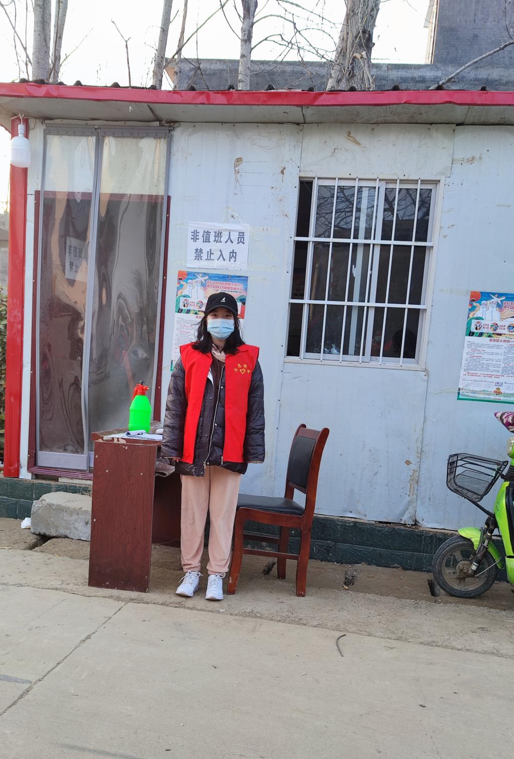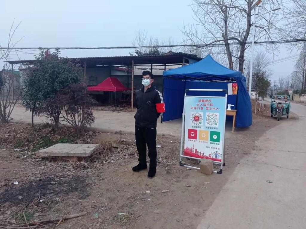 在返乡经过自觉七天居家隔离后,1月3日,王新雨再次加入了家乡抗疫防控工作。主要负责所在村庄重要交通路口的卡点值班,对来往车辆行人进行询问、测量体温、登记等,全力以赴、科学有效做好疫情防控工作,践行初心与使命。