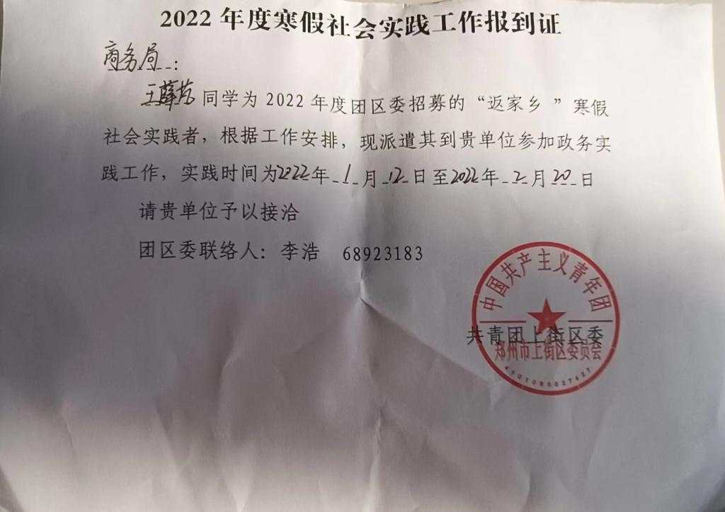 王薛芃同学为2022年度上街区团委招募的“返家乡”寒假社会实践者,为家乡在防疫工作方面尽自己的一份力。根据工作安排,主要帮助部门检查各大超市的防疫措施落实情况,如口罩佩戴情况,每日消杀情况等。做到“有工作必有落实”,一天两检,不仅是检查商场的防疫措施,更是对群众的一种保护。疫情期间,我们不仅要做好自己的防护,更要在公共场合,提醒每一位群众注意防护,也需要让商家,将防疫、消杀工作落实到位,把防疫工作中做彻底,做到位。