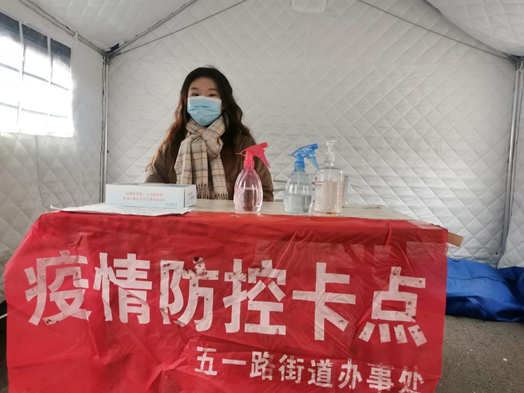 1月份疫情防控工作开展以来,19国商02阎旭垚同学积极响应公司、社区号召,加入到了社区疫情防控志愿服务队伍之中。依照五一路街道办事处安排,她在运粮河街疫情防控卡点负责规劝行人自觉居家、制止散户菜贩在街道销售蔬菜等工作,以最大限度减少人员流动,加强疫情防控,助力筑牢疫情“防火墙”。莫道春光难揽取,浮云过后艳阳天。她坚信,全民上下齐心攻坚克难,我们定能战胜疫情,挺过凛冬。
