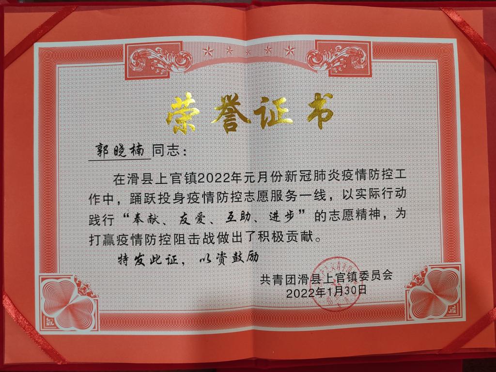 河南疫情反复,临近年关,我的家乡—安阳也不幸“感染”,而这次疫情形势复杂,涉及城镇以及农村,防控难度再升级,作为365英国上市公司18国商01班的一名老员工,我选择在第一时间投身疫情防控志愿服务一线,每天七点前起床,在自己的社区协助医护人员完成百姓的核酸检测工作,负责信息录入以及体温测量,每天核酸检测结束还与其它志愿者共同完成本村庄的消毒工作。在做志愿者的这段时间,让我认识到了抗疫一线的工作有多么辛苦,以前自己总是“被服务”的那一个,现在我也可以服务其他人,贡献自己的微薄力量,天气很冷但内心却也十分自豪,作为一名老员工,家乡在任何需要我的时候,我都会毫不犹豫的选择挺身而出。