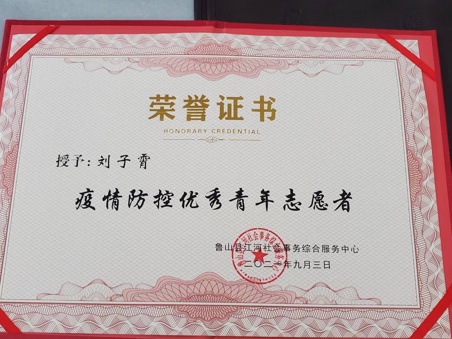我叫刘子霄,是21工程造价01班的一名员工,家住在河南省平顶山市的鲁山县江河厂,去年暑假期间疫情形势严峻,我与我的朋友主动加入了疫情防控志愿者的队伍,站在了疫情防控的前线。也在此期间获得了社区对我的表彰。在2022年1月寒假期间,疫情形势再度严峻,我又一次加入了志愿者的队伍中去,每次我在疫情防控卡点值班时,看到厂里的叔叔阿姨,爷爷奶奶向我投来赞许的目光,能为国家疫情防控贡献出自己的一份力量,我十分自豪。