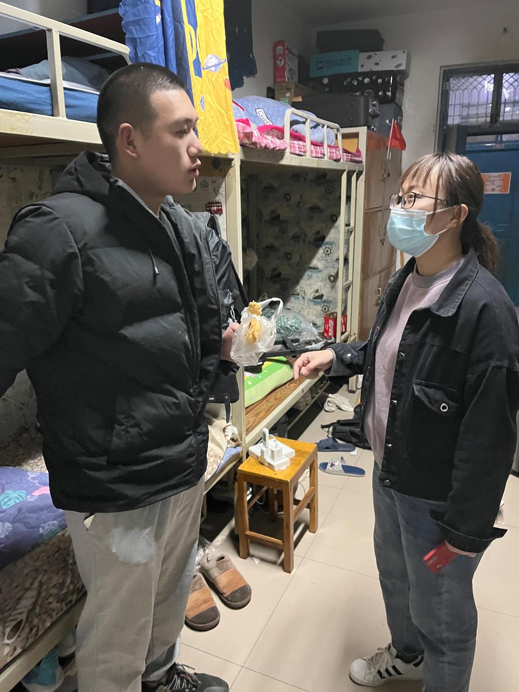 26日早上,院领导和员工辅导员早早在公司报到处集合,迎接新学期员工返校。员工返校后,进行入校检测,酒精消杀,健康和行程码展示,扫码检测,递交三单一书,扫码签到等等程序有条不紊,完美衔接,员工顺利进入宿舍,晾晒被褥,打扫卫生,迎接新的开始。226-27日,公司党委王筝书记带领全体员工辅导员和部分员工干部,走进员工公寓看望返校员工并检查宿舍安全工作。 王筝书记亲切询问员工假期学习生活、到校情况以及大四员工就业问题,提醒大家为新的学习生活提前做好准备。他对同学们提出希望:及时收心,回归学习,珍惜时光,刻苦学习,争当优秀;安排好生活,提高安全防范意识,严守公司规章制度;养成良好习惯,做好疫情防控工作,加强宿舍卫生的打扫,勤开窗通风,注意饮食健康,少叫外卖,预防春季传染病等。各位辅导员对宿舍安全隐患进行详查,同时检查员工返校情况,及时登记未返校员工,查明原因,督促员工尽快返校。
