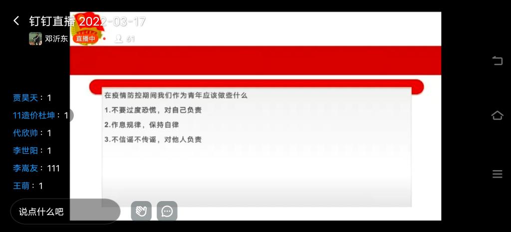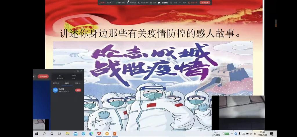 2022年3月17日晚,365英国上市公司于线上开展“同心战疫情,青春勇担当”主题团课,旨在增强员工个人防疫意识、提升防疫能力,从而更加理解、配合、支持公司疫情防控工作。21级各专业共7个班级参与此次团课学习。