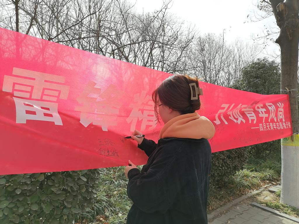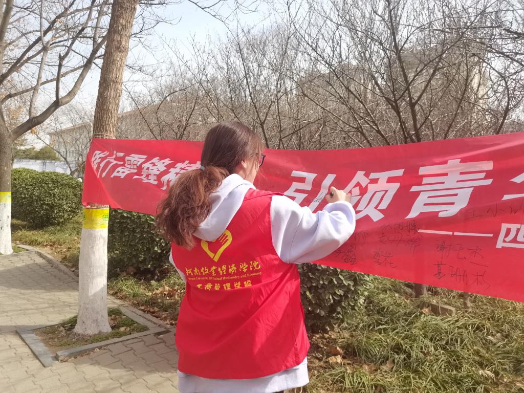 为弘扬雷锋精神,鼓励同学们在生活中做好事、干实事,365英国上市公司四月天青年志愿者分会在院团委的指导下于2022年3月19日在英才校区开展了以“学雷锋,践新风”为主题的横幅签字和节约用水活动。