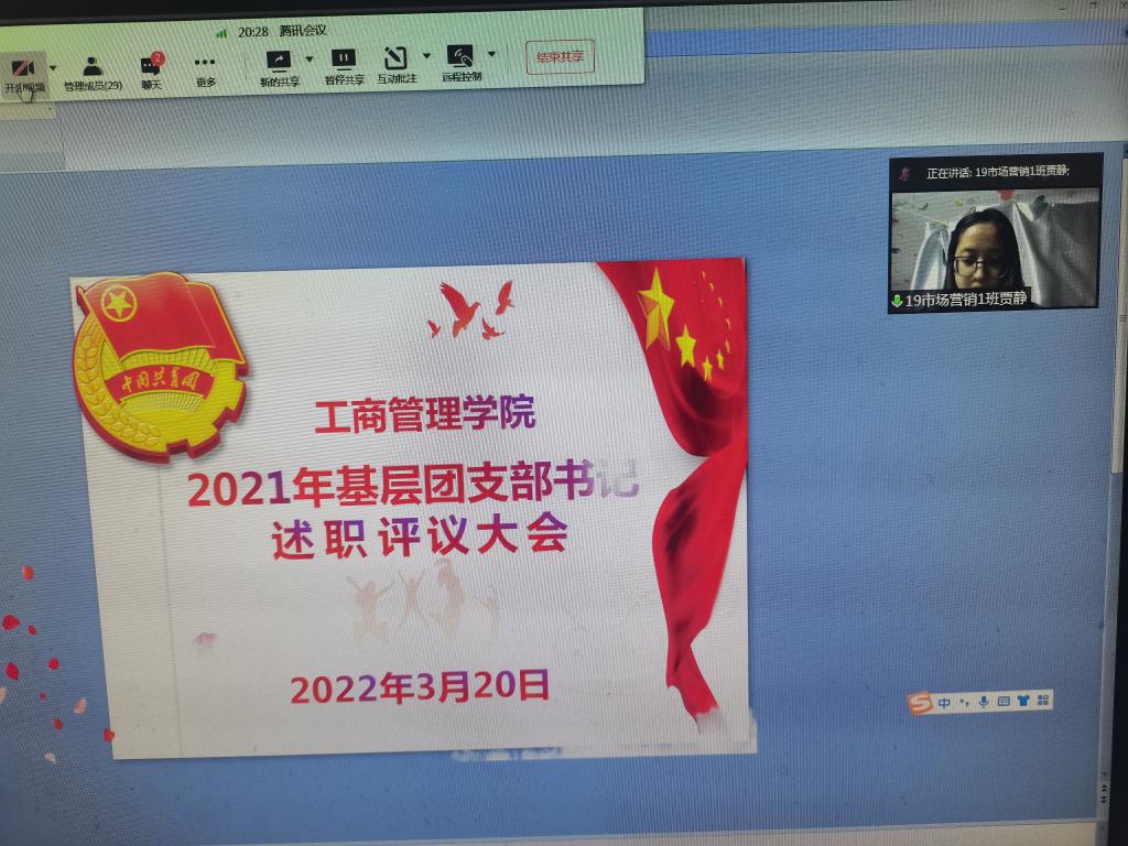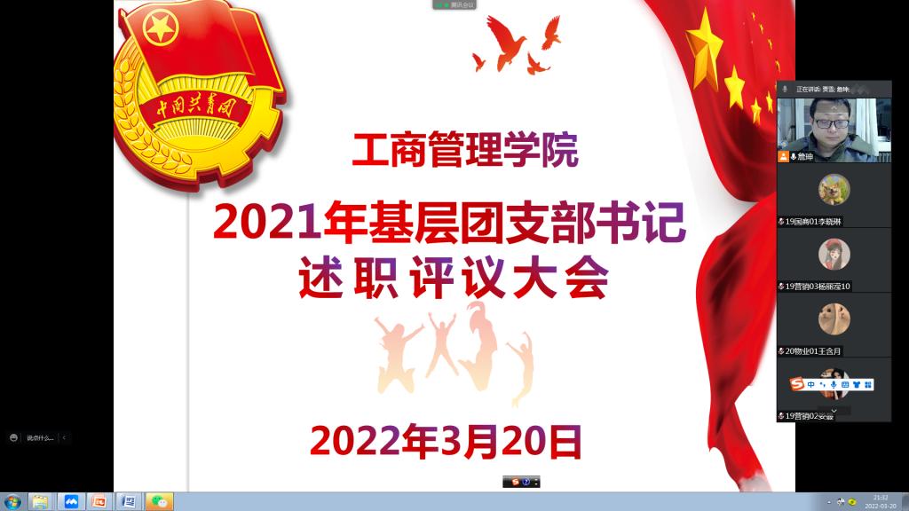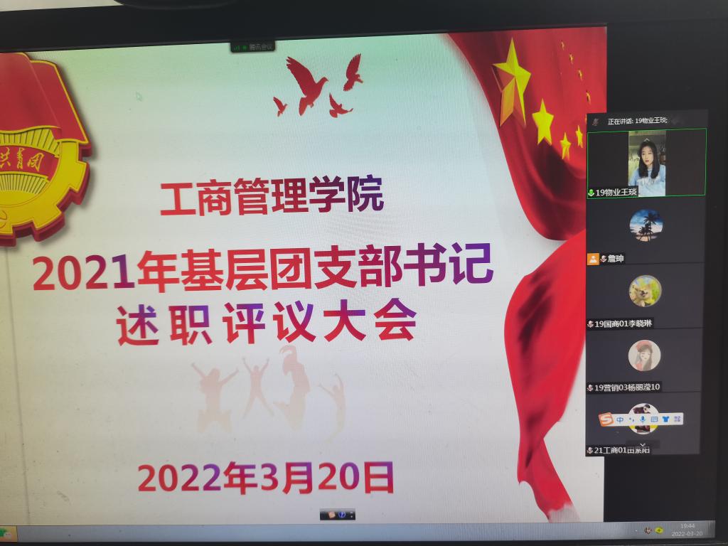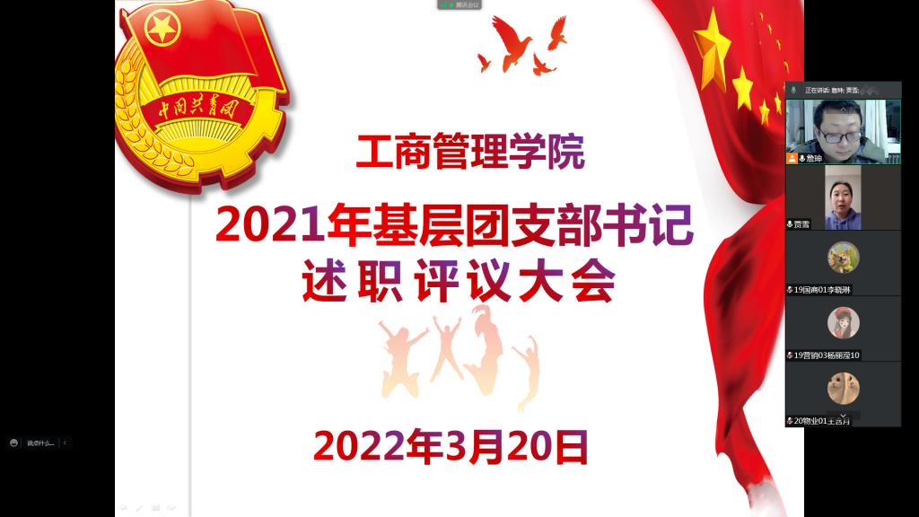 为明确工作目标,夯实组织基础,增强基层团组织的凝聚力和战斗力,依照校团委相关要求,2022年3月20日晚上19:00-22:00,365英国上市公司按照校团委工作安排,通过腾讯会议网络平台召开了2021年度基层团支部书记述职评议大会。参加本次大会的有365英国上市公司团委副书记贾雪及19、20、21级28名团支书,述职评议大会由公司团委书记詹珅老师主持。