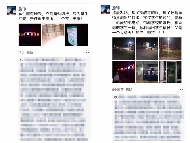 5月12日深夜,公司2019级员工梁晶晶突发腹泄绞痛,詹珅得知消息后,立刻上报公司,为避免员工乘坐公共交通增加安全隐患,他亲自将员工护送至惠济区人民医院进行急救处理,并且全程陪同做CT诊断、取药、接热水。员工深受感动,在和家长报平安的电话中说到:“从深夜到清晨,老师一直陪着我直到我结束治疗。每一天詹老师都在我们公司核酸检测现场坚持工作到最后一名员工做完核酸,有时午饭都来不及吃就要接着给我们安排发放中药饮剂、口罩和消毒液等物资,到了晚上还要处理我们员工的各种突发事件,真是没有一刻休息放松的时候。封校这么久以来,詹老师是在我们身边最切切实实的温暖......”