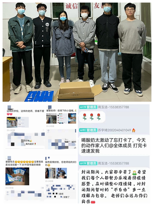 当前,疫情防控已进入攻坚时期,作为辅导员更要充分发挥知心人、热心人和引路人的作用,周玉洁老师深知把自己每一位同学守护好、引导好、安抚好就是为此次“战疫”做贡献。她不仅与员工互动交流,为大家提供必要的情感、心理支持,教给员工情绪疏导的方法窍门,帮助员工进行心理减压,更是自费为员工购买酸奶,用爱和科学的力量架起了一座“连心桥”。她告诫每位同学都要主动防护,有效应对。面对疫情要理性对待,不轻视、不恐慌。帮助员工以自信乐观的心态面对困难,做一名生命健康的守护者、认真笃学的修行者,游必有方的识图者。