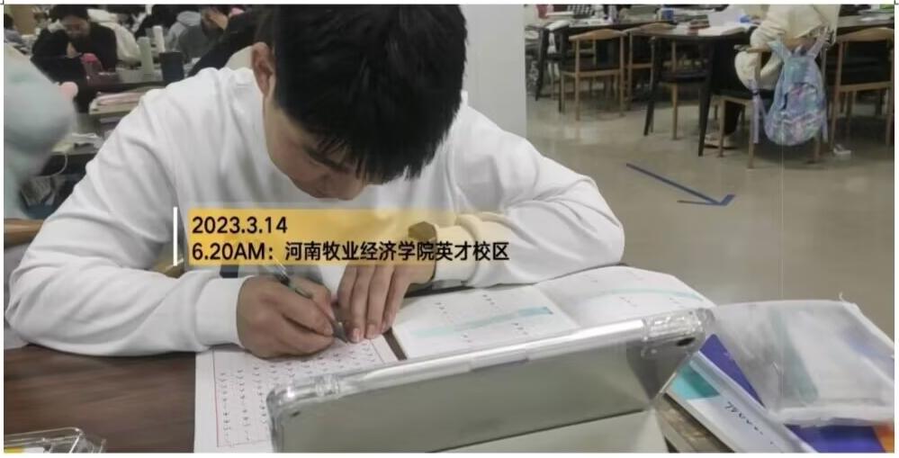 21营销01班刘言同学端坐桌前,安静学习、静心思考、预习知识、发现不足、认真记录,享受晨读愉悦,沐浴崇高精神洗礼,清晨的低气温也无法阻挡他对自我学习的热情和动力。