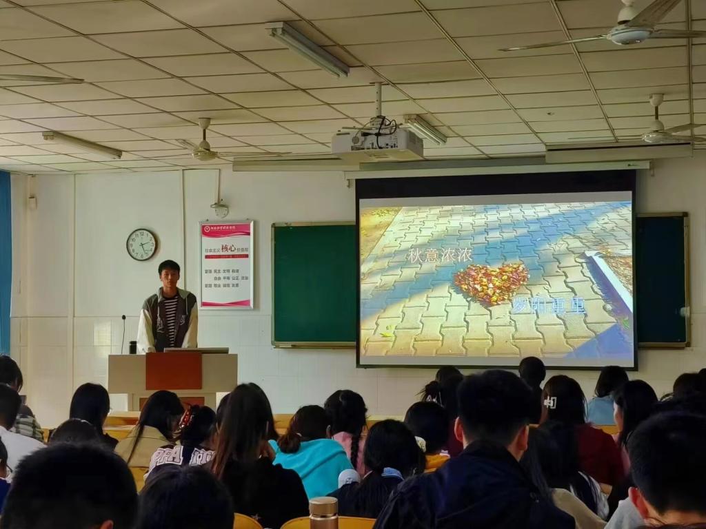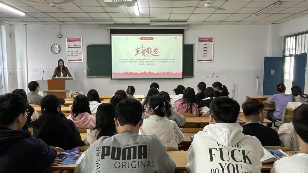 v23市营升本01班王彩茹同学结合相关典籍佳句阐述重阳节的文化内涵,通过优美典雅的诗句和有趣生动的故事向同学们介绍重阳节的文化内涵,宣扬敬老爱老传统美德,增强员工爱老敬老意识。