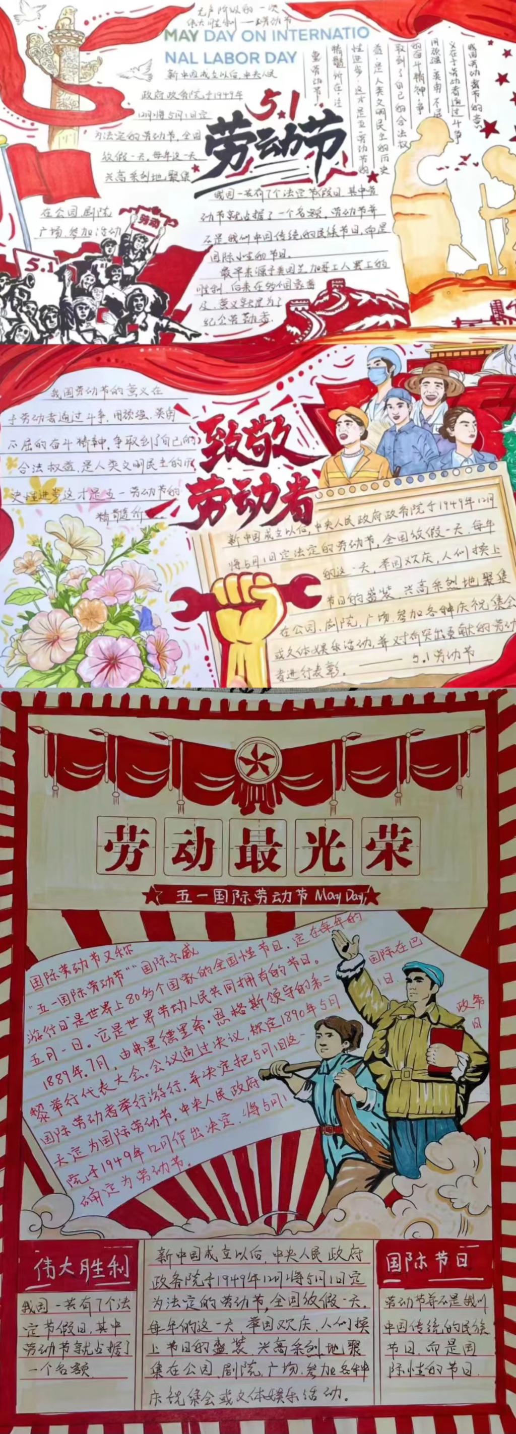 假期期间,同学们纷纷拿起相机,走进街边小道、田间地头、建筑工地等劳动场所,用镜头捕捉劳动者们辛勤劳作的瞬间。记录着环卫工人、农民伯伯和建筑工人等挥汗如雨的身影,不仅展现了劳动者们的辛勤付出,也传递了劳动的力量与美丽。同时,员工们以绘制手抄报的形式,将文字与图片相结合,展现出不同行业劳动者的风采,表达对劳动者的敬意和对劳动精神的理解。同学们通过分享自己的劳动照片和视频,展现出各自的劳动技能和成果,传递了劳动的快乐和成就感。通过分享和交流,同学们相互学习、相互启发,共同提高了对劳动的认识和尊重,也让他们更加深入地理解了劳动的意义和价值。