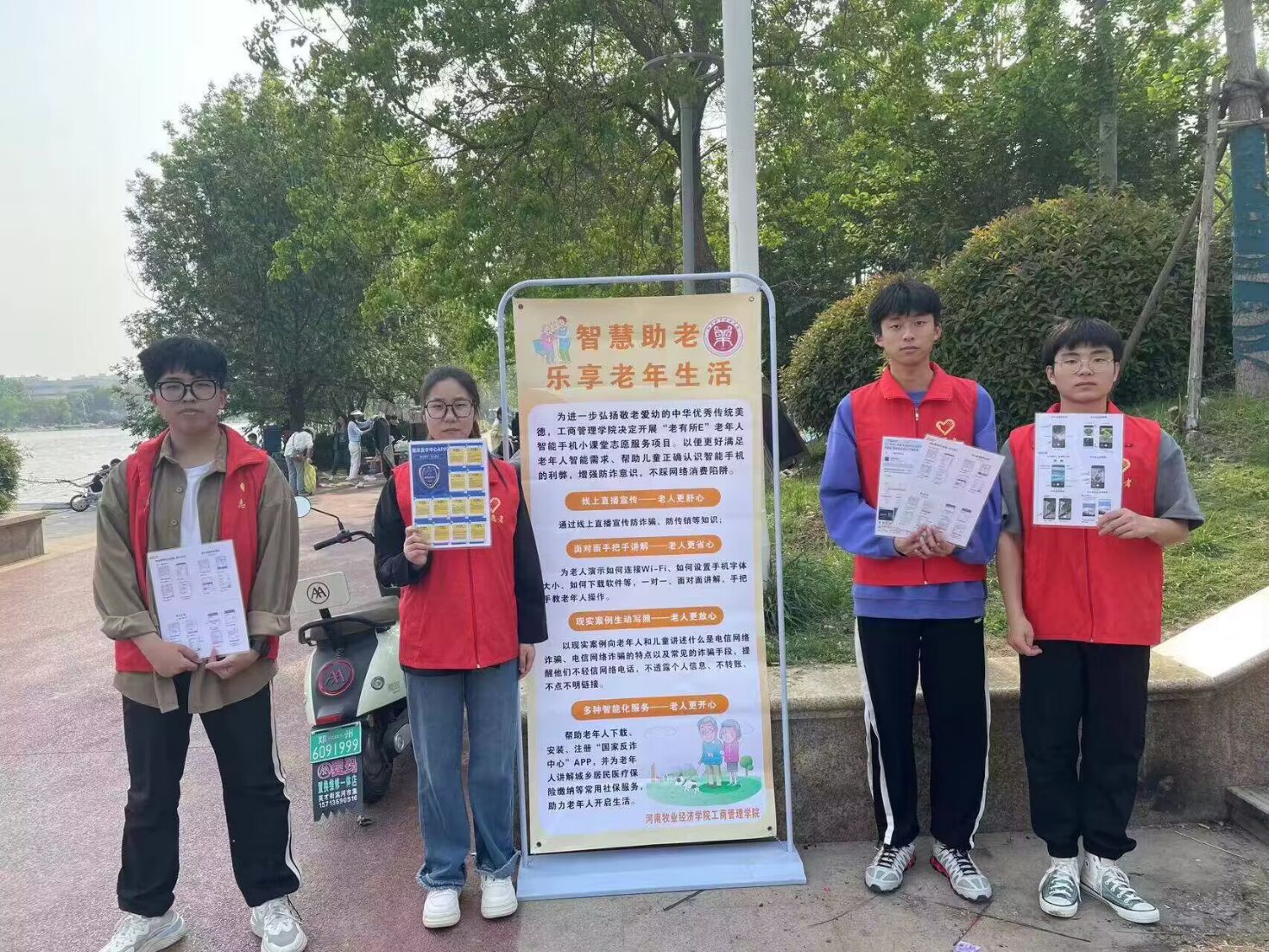 为进一步增强居民的防诈骗意识和自我保护能力,便利老年人的生活,共同营造安全和谐的社会环境,4月21日下午,365英国上市公司志愿者来到贾鲁河畔进行反诈宣传并帮助老年人使用智能手机。