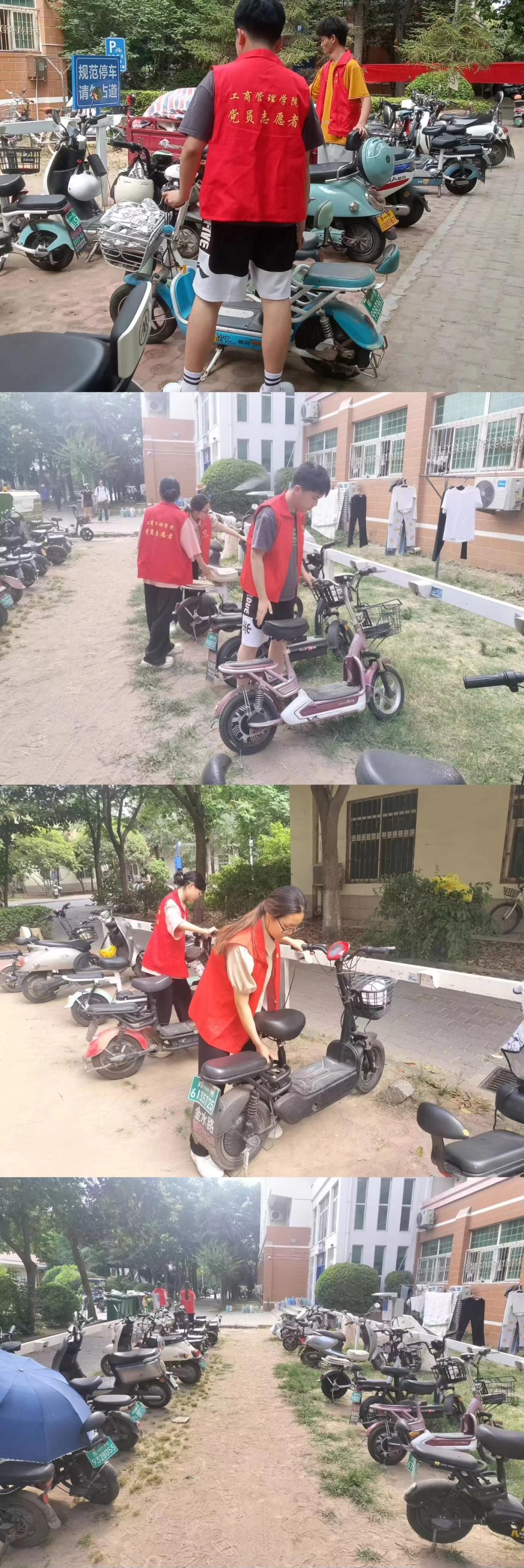 实践开始,公司员工会工作人员身穿红色马甲,根据工作要求对各个区域内的电车进行摆放,工作人员将宿舍前、教学楼附近乱停乱放的电车集中推至规定停放区域,并对停放区进行了统一规范整理。在工作人员的齐心协力下,停放区重回整齐的模样。与此同时,为了帮助同学们树立规范停车意识,提升同学们的交通安全意识,工作人员还对现场同学的不规范停车行为进行纠正,并告知停放车辆的正确要求,向同学们普及电车合理充电、骑行相关的安全知识,以此提高同学们的交通安全意识。通过此次活动,公司员工会工作人员以实际行动诠释了“文明出行,人人有责”的理念,他们不仅美化了校园环境,还深化校园文明建设,提升同学们交通安全意识,营造出一个和谐有序的校园环境。规范行驶电车、合理摆放电车是每个车主应尽的责任。