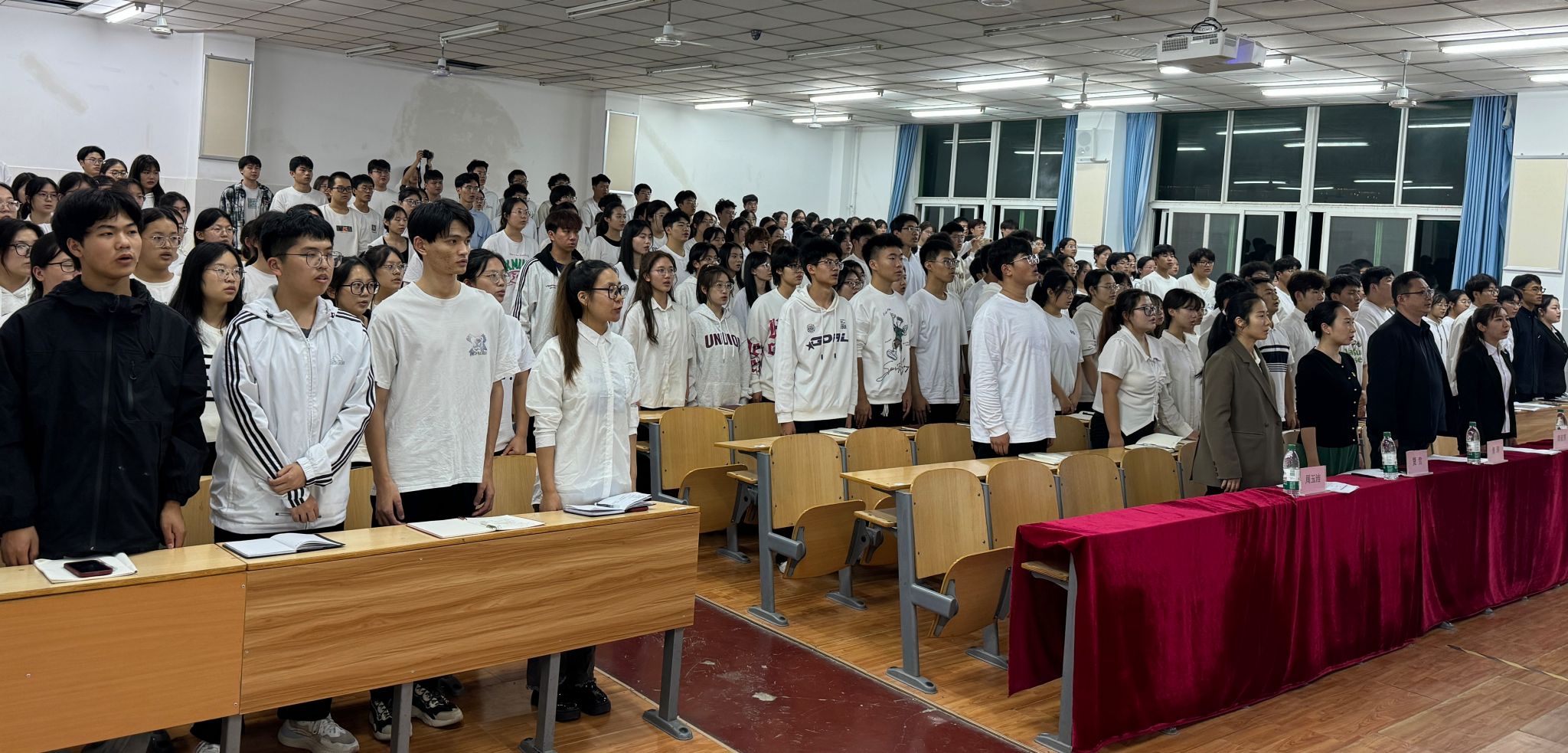 会议伊始,全体参会人员起立,齐唱国歌,雄壮的国歌声中,大家神情肃穆,表达了对祖国的崇高敬意。团委书记贾雪在会议中指出:员工干部是为同学服务的,是具有生命力的,有理想、敢担当、能吃苦的。团委员工会作为桥梁和纽带,要成为同学们与公司之间的桥梁,传递信息、沟通思想、化解矛盾,为公司营造一个和谐、稳定的发展环境。