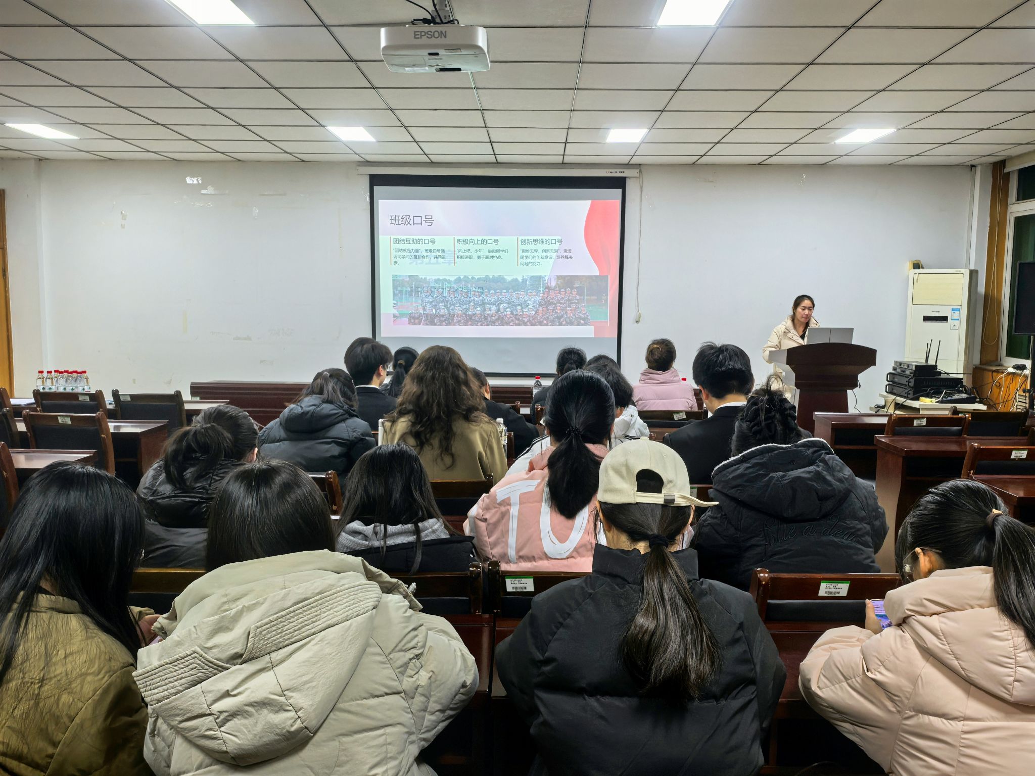 比赛伊始,率先登场的是23国际商务01班的同学代表吴璐璐。她以饱满的热情和条理清晰的讲解,全面介绍了23国际商务01班在班风建设、、学风建设、一站式服务、党纪学习教育、文化培育以及制度建设等方面的丰富成效。她生动描绘了班级团结奋进、全面发展的精神风貌,让在场观众深刻感受到了该班级的凝聚力和活力。随后,资鑫秋、张翼、杨孝岩等同学依次代表本班登台亮相,他们分别从独特视角出发,深入剖析了各自班级的鲜明特色。通过精心制作的PPT和激情洋溢的演讲,全方位展示了班级独特的班风文化和魅力风貌,赢得了在场观众的阵阵掌声。大赛尾声,团委书记贾雪、团委副书记席亚芳、周玉洁分别进行了专业且深入的点评与打分,她们对参赛班级的表现给予了高度评价,同时也提出了宝贵的建设性建议,为各班级后续的发展指明了方向。