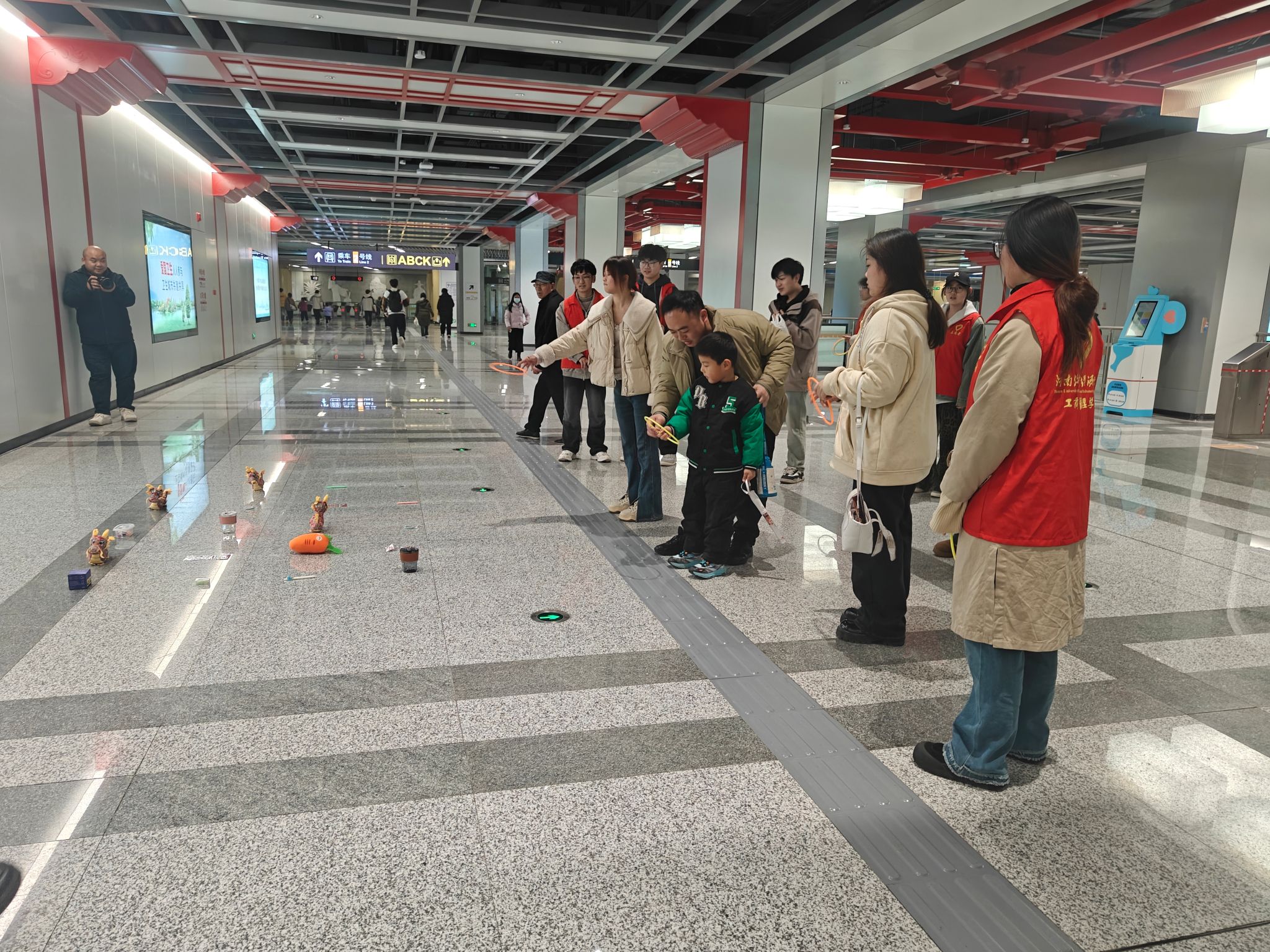 活动当天,志愿者们早早来到地铁站,在工作人员的指导下,迅速熟悉了各个岗位的工作内容和注意事项。他们身着统一的志愿者服装,热情地投入到服务中。志愿者们分散在地铁站的各个角落,为乘客提供全方位的帮助。在活动过程中,志愿者们耐心解答乘客疑问,协助老人、儿童及不熟悉电子支付的乘客顺利进出站。在站台处,志愿者们承担起了关门提醒的重要任务。列车进站时,他们站在安全线附近,引导乘客有序上下车。同时,迎宾路地铁站还设置了趣味套圈游戏区,在地铁站的空旷区域,志愿者们精心布置了套圈场地,地上摆放着各类实用的小礼品,乘客们只要回答对关于雷锋事迹、精神的问题,就能获得套圈机会。这一活动吸引了众多乘客的参与,大家在游戏的同时,也加深了对雷锋精神的了解。小朋友们在家长的带领下积极答题,拿到套圈后兴奋地尝试,现场充满了欢声笑语。老员工志愿者们通过新颖有趣的套圈活动和贴心细致的服务,将雷锋精神融入到每一个行动中。他们用热情和奉献为乘客们营造了一个温馨、便捷、安全的出行环境,赢得了乘客们的一致好评和赞誉。