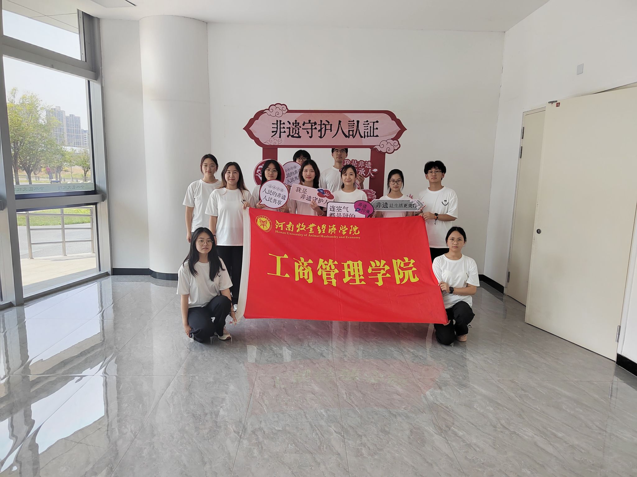 踏入展馆,浓厚的艺术氛围扑面而来。队员们跟随着讲解员的指引,穿梭于不同展区,在色彩碰撞中了解厚重的历史文化故事。参观途中,队员们自发组成讨论小组,围绕作品的文化内涵、创作手法进行交流。在一幅人物主题画作前,大家聚焦画面细节,探讨艺术如何传递情感与时代印记,从色彩运用到构图设计,从文化符号解读到创作意图揣摩,思维的火花不断迸发。负责讲解的队员结合提前查阅的资料,为伙伴们补充作品背后的文化故事,让参观不止于“看”,更深入“悟”。除了静态展品,社会实践团队也积极体验剪纸创作,在折、剪、刻的过程中,体会传统工艺的精巧与不易。活动尾声,实践服务队在“大河考古博物馆”标识前整齐列队、合影留念。