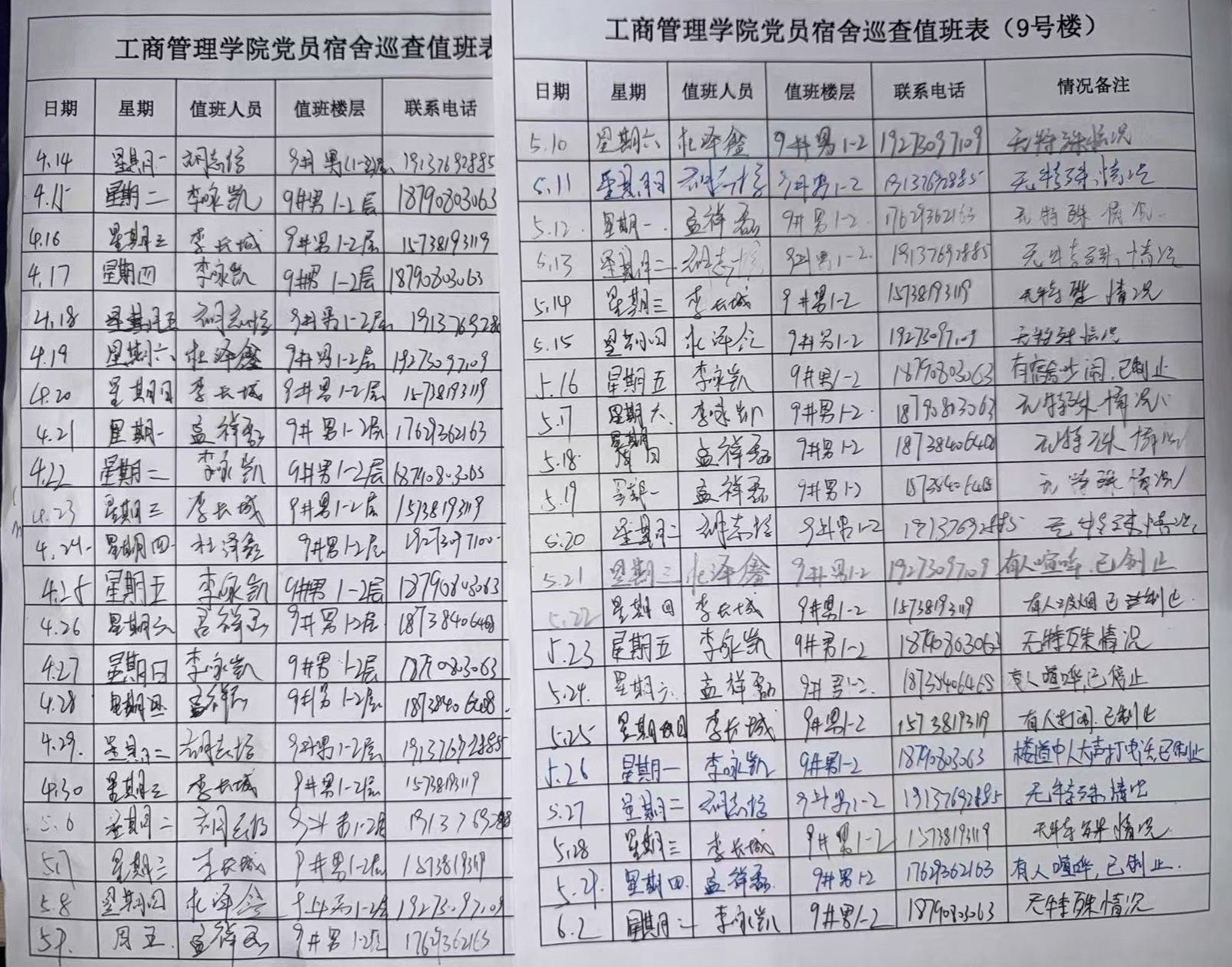 巡查过程中,值班党员严格对照安全标准执行任务。他们核对宿舍人员信息,重点排查夜不归宿情况,确保每位同学安全。同时,密切关注宿舍及楼道内动态,及时制止大声喧哗、冲突等不文明行为,维护夜间休息秩序。针对宿舍内违规抽烟等安全隐患,党员们仔细检查角落、卫生间等隐蔽区域,发现问题立即劝导纠正,并及时上报。此外,党员们还主动与同学沟通,宣传安全知识,增强大家的自我保护意识。巡查结束后,值班党员都会前往各楼指定宿舍地点,在统一的巡查值班表上签名,并详细标注巡查情况。记录表中如实记录发现的问题,通过签字留痕与记录内容,既确保了巡查工作可追溯、有依据,也便于公司汇总分析共性问题,为后续优化宿舍管理提供详实的数据支撑。