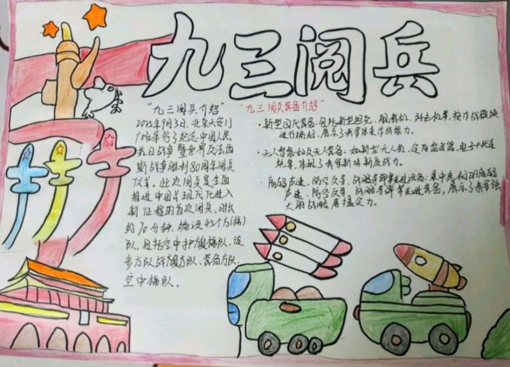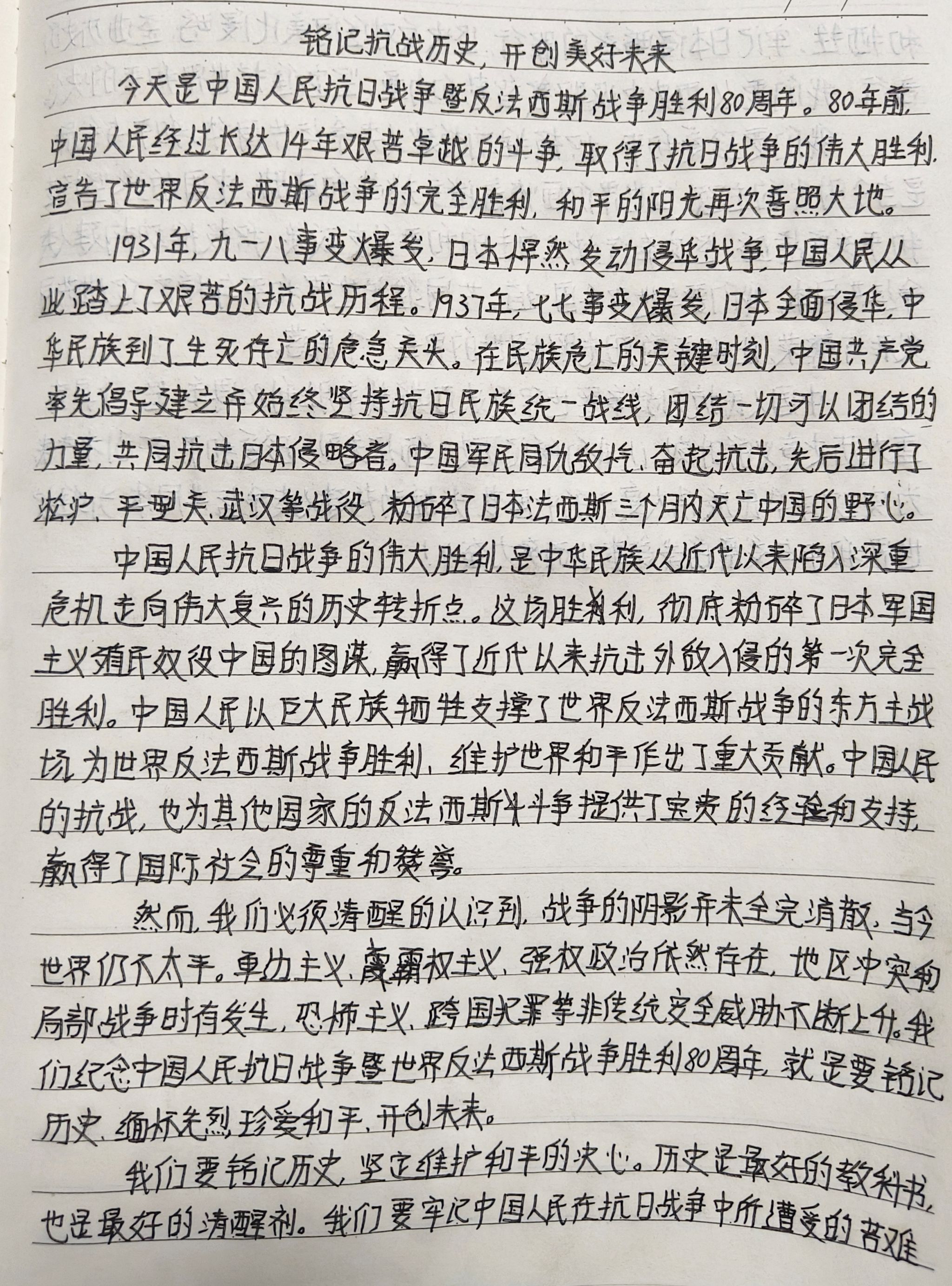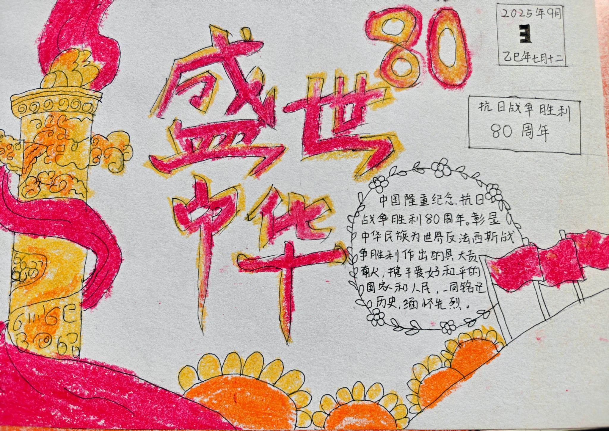 活动期间,同学们热情高涨、积极参与,将阅兵式上的庄严军容、先进装备、老兵风采等深刻记忆与自身的校园学习生活、青春理想追求相融合,通过诗歌、文章、手抄报等形式展开创作。在诗歌创作环节,同学们描绘“铁甲洪流奔向前,山河无恙续新篇”的壮阔图景,书写“八秩春秋铭国耻,今朝我辈振山河”的壮志豪情,字里行间满含对祖国强大的自豪与对使命担当的认知。在文章创作中,同学们结合校园里的理论学习、志愿服务、科创实践等经历,分享从阅兵精神中感悟到的“奋斗”“自强”真谛。手抄报创作则成为视觉化的“爱国宣言”,同学们巧妙融合阅兵元素与校园场景,用鲜艳的色彩勾勒受阅方阵,用工整的字迹摘录抗战历史与理想誓言,将红色记忆与青春色彩生动呈现。这些优秀的作品,缅怀着革命先烈为民族独立和世界和平抛头颅、洒热血的英勇事迹,承载着当代青年铭记历史、缅怀先烈、珍爱和平、开创未来的决心。